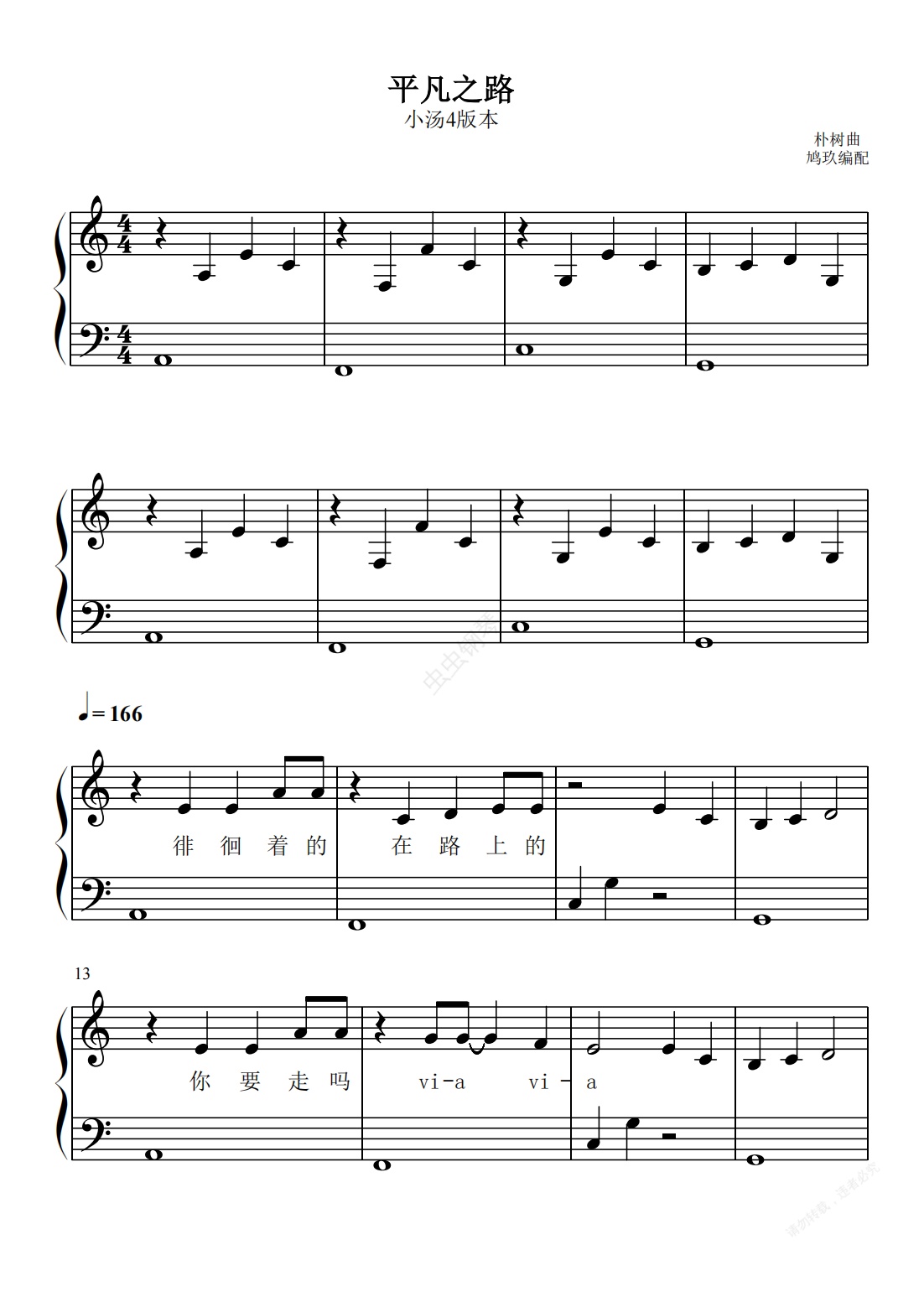 钢琴谱:平凡之路(小汤4版)儿童C调版