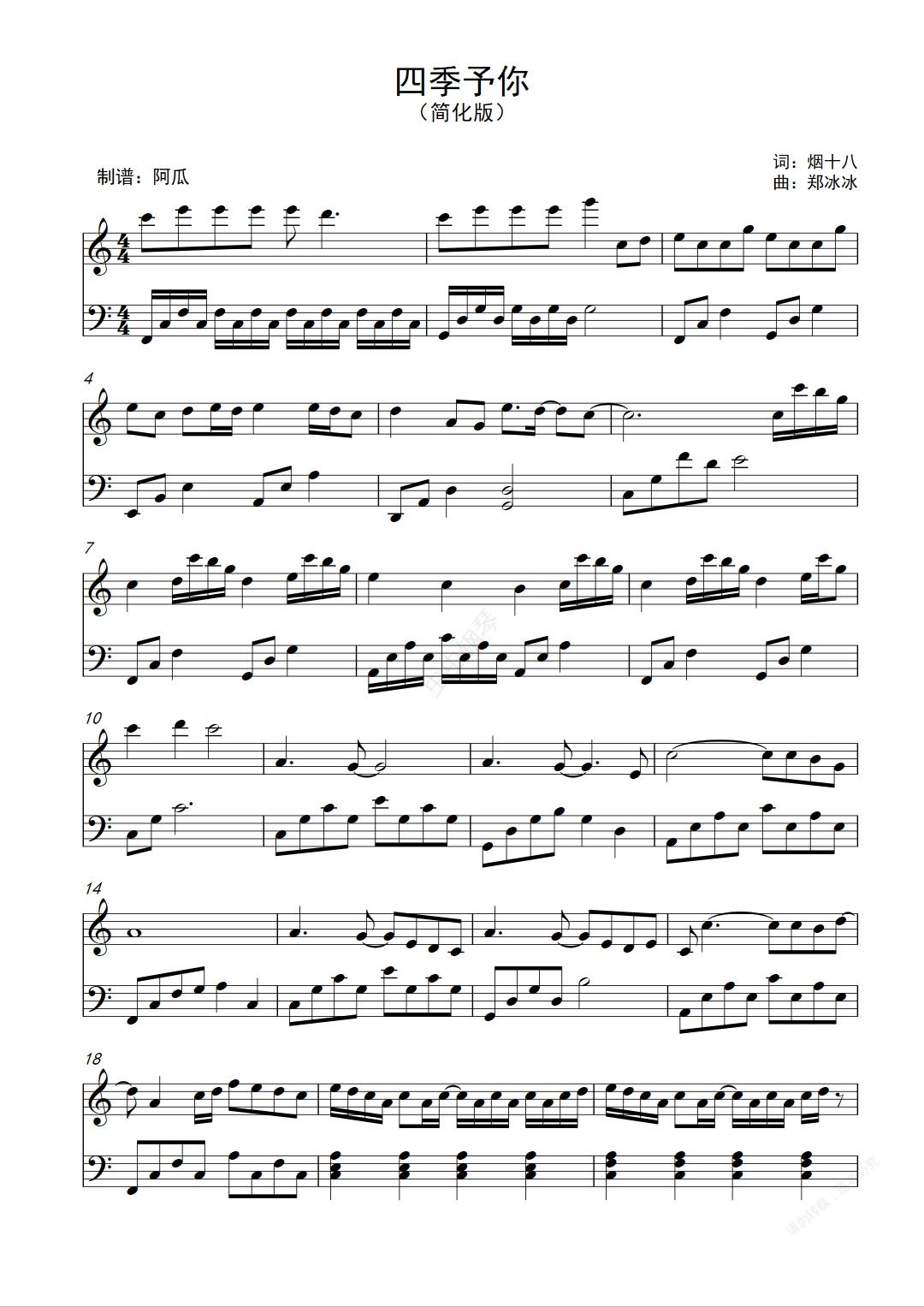 钢琴谱:四季予你-C调(简化版)