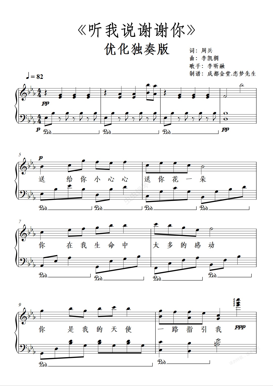 钢琴谱:《听我说谢谢你》李昕融-原调优化独奏版