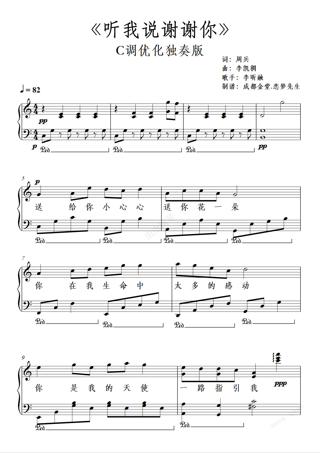 钢琴谱:《听我说谢谢你》李昕融-C调优化独奏版