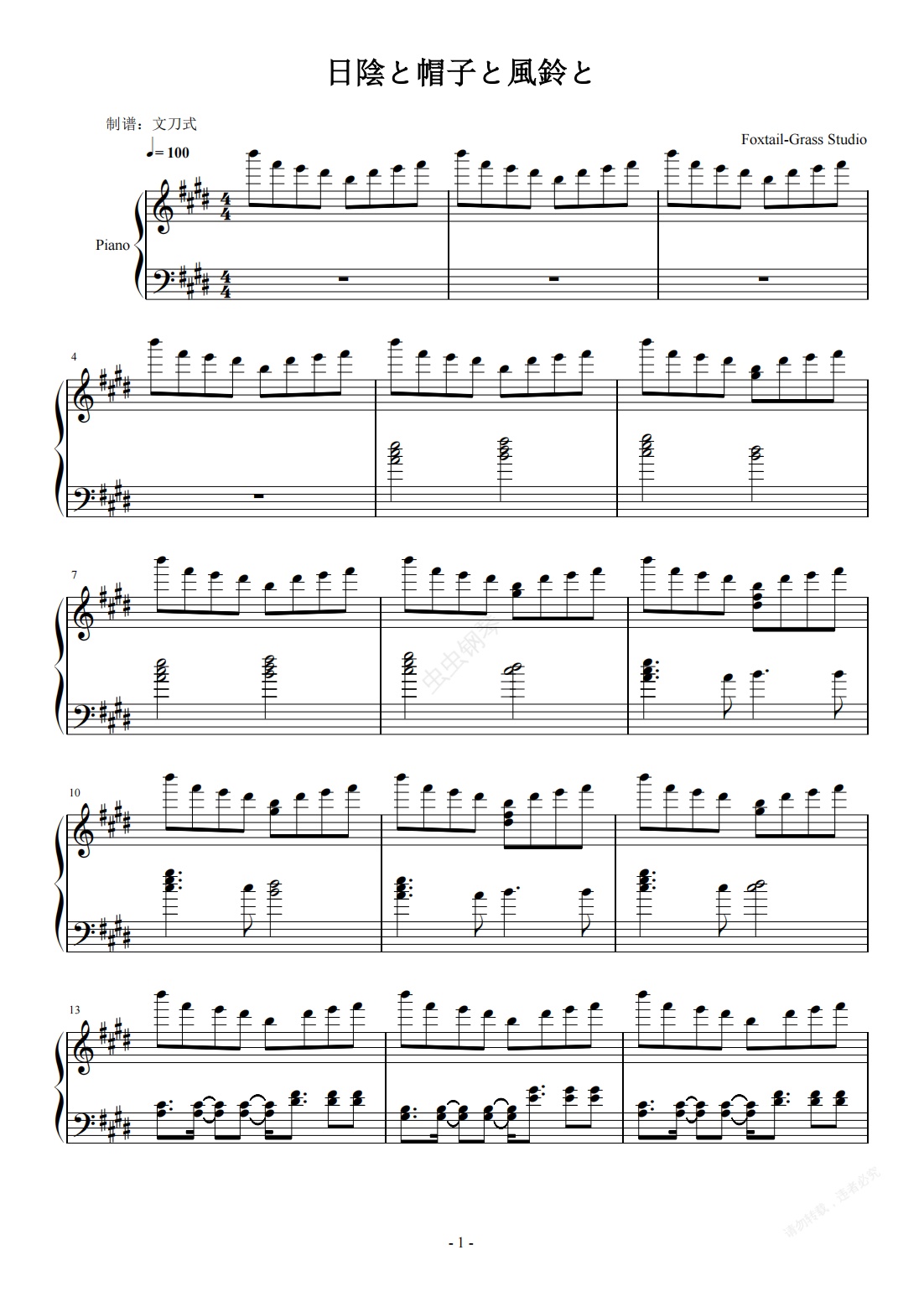 钢琴谱:东方幻想乡《日陰と帽子と風鈴と》云流同作者