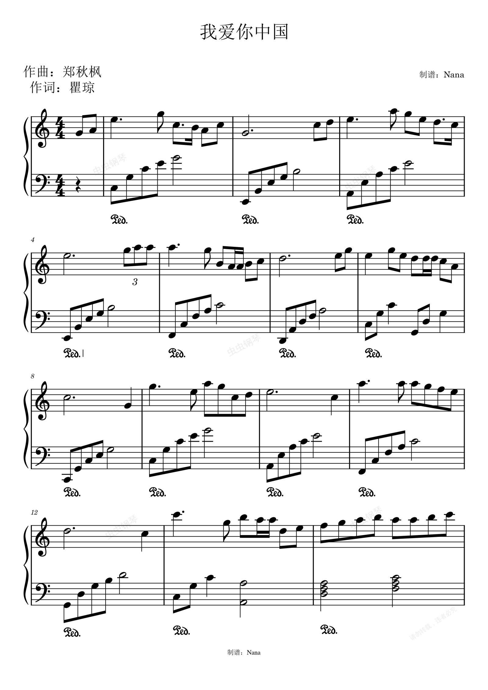 钢琴谱:我爱你中国—C调简易版