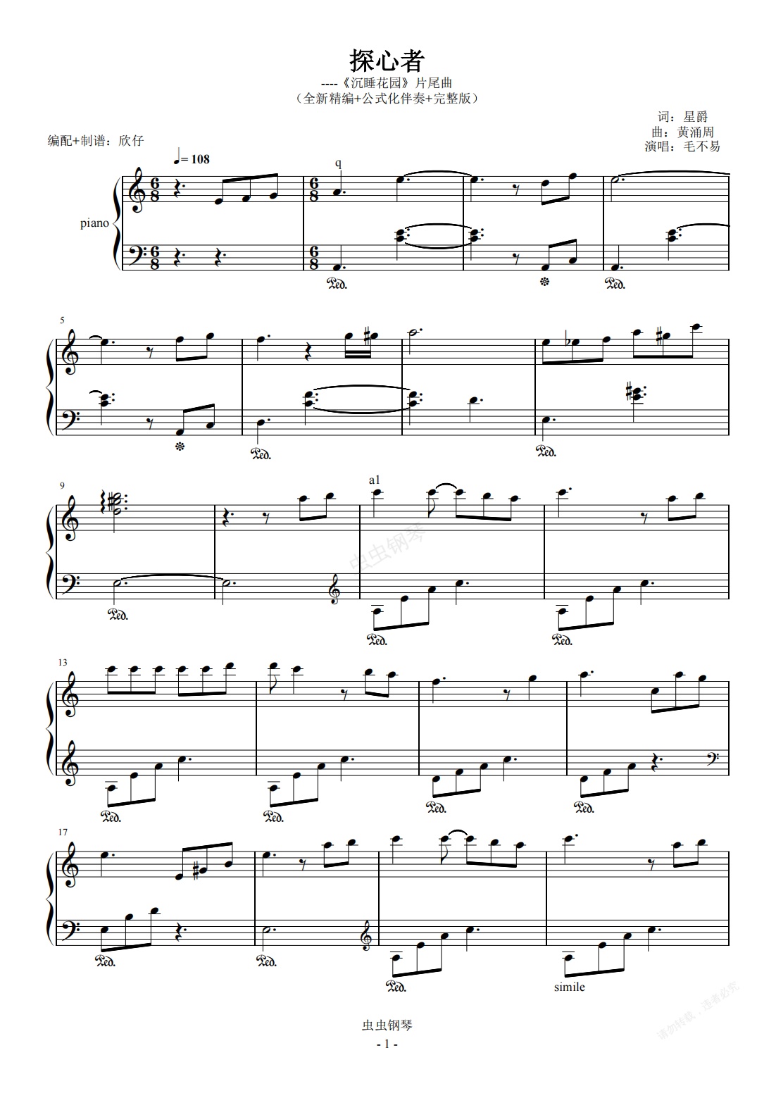 钢琴谱:毛不易-C《探心者》(《沉睡花园》片尾曲、较公式化伴奏+完整版)