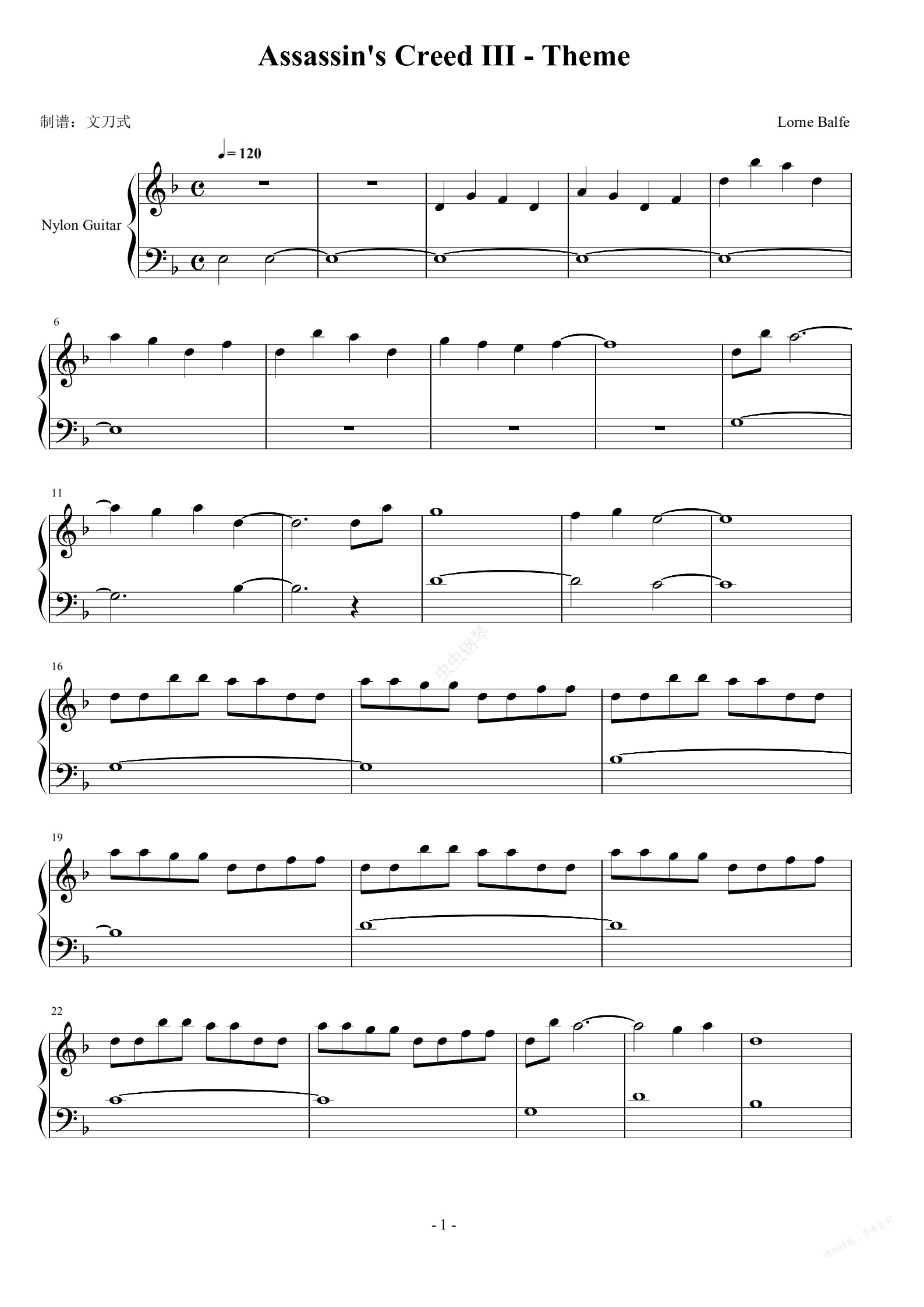 钢琴谱:刺客信条3主题曲