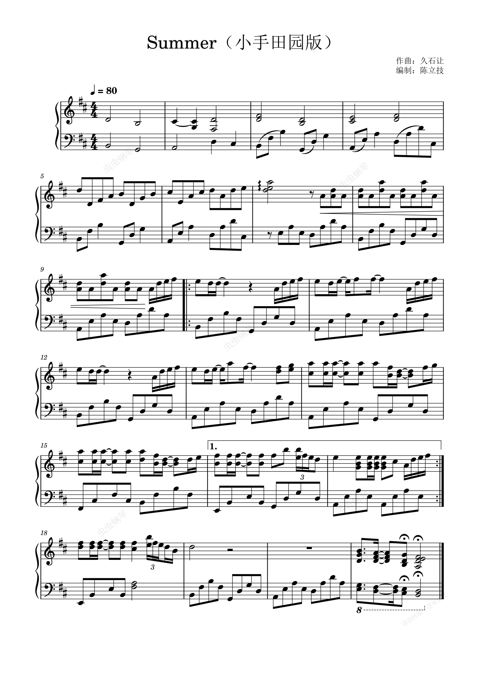 钢琴谱:Summer 电影《菊次郎的夏天》主题曲 小手田园版 - 久石让