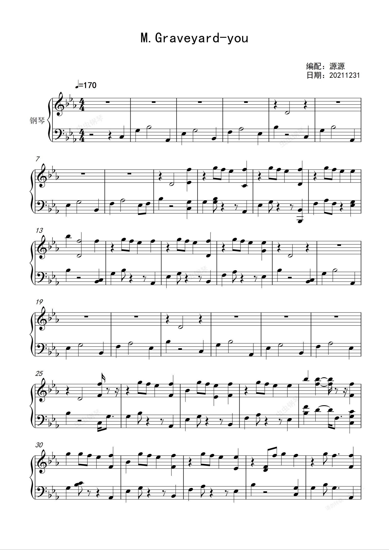 钢琴谱:you-M.Graveyard 纯音乐 完美独奏谱