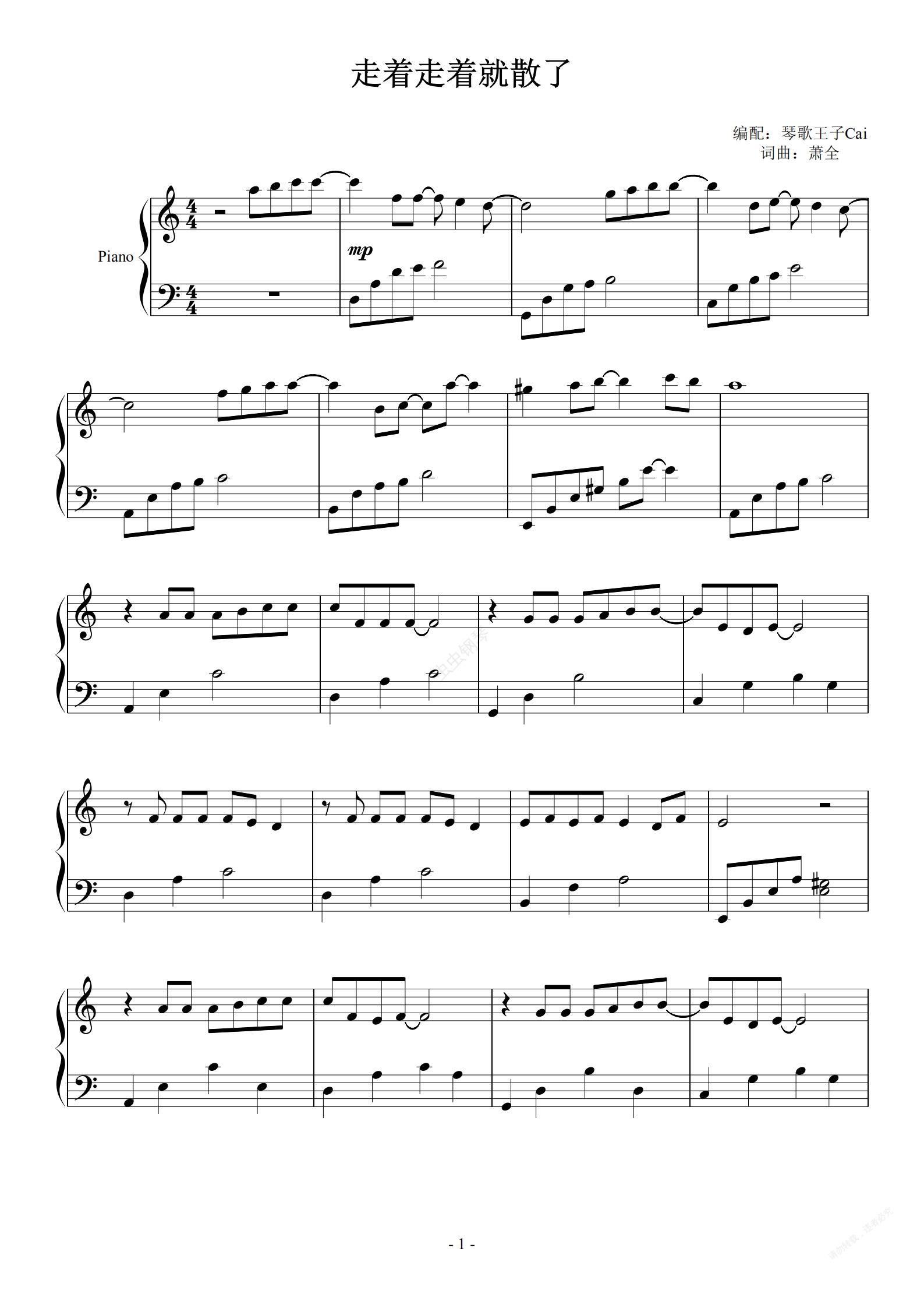 钢琴谱:走着走着就散了(琴歌王子Cai钢琴版)C调