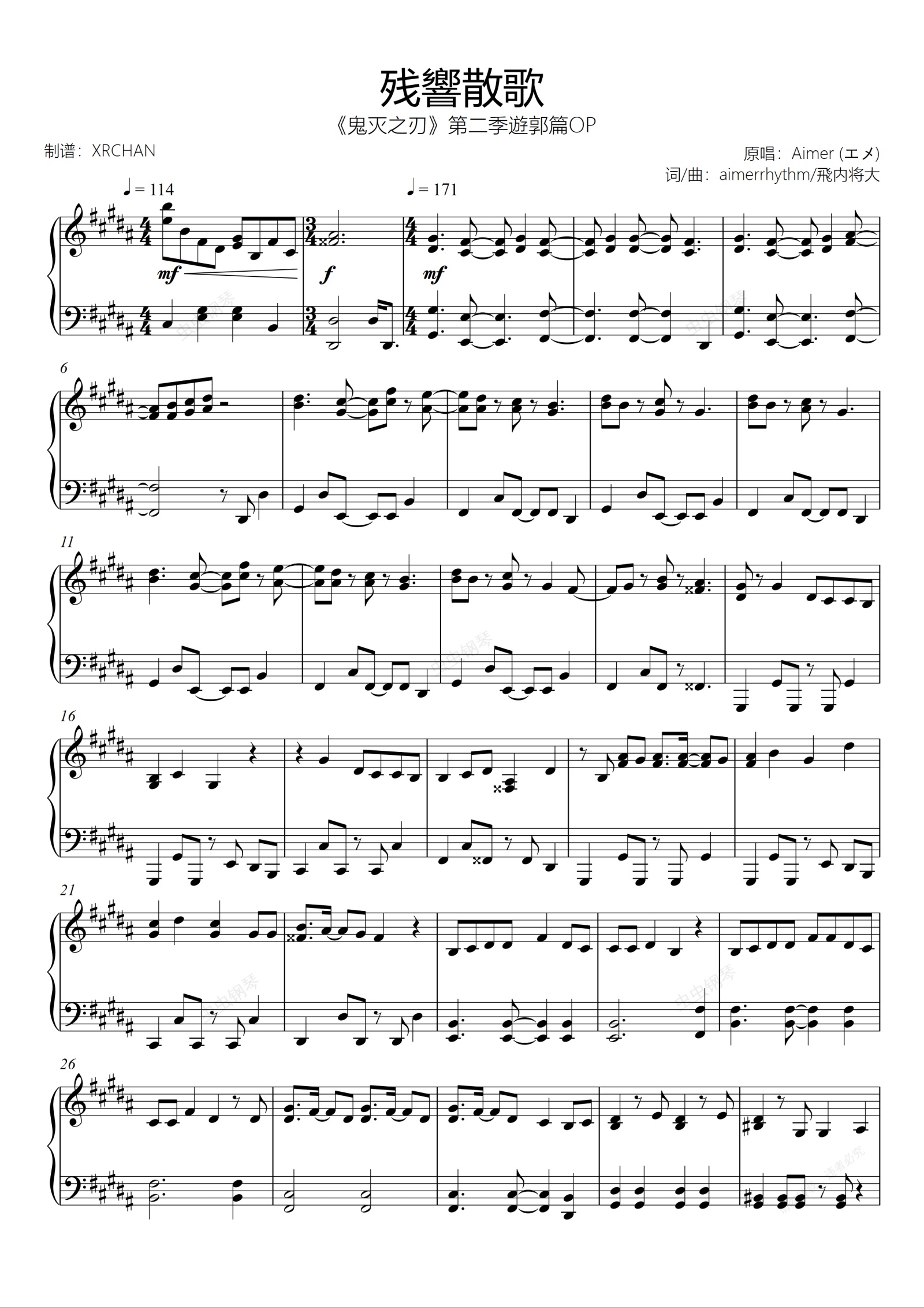 钢琴谱:《鬼灭之刃》 游郭篇OP 残響散歌 初级