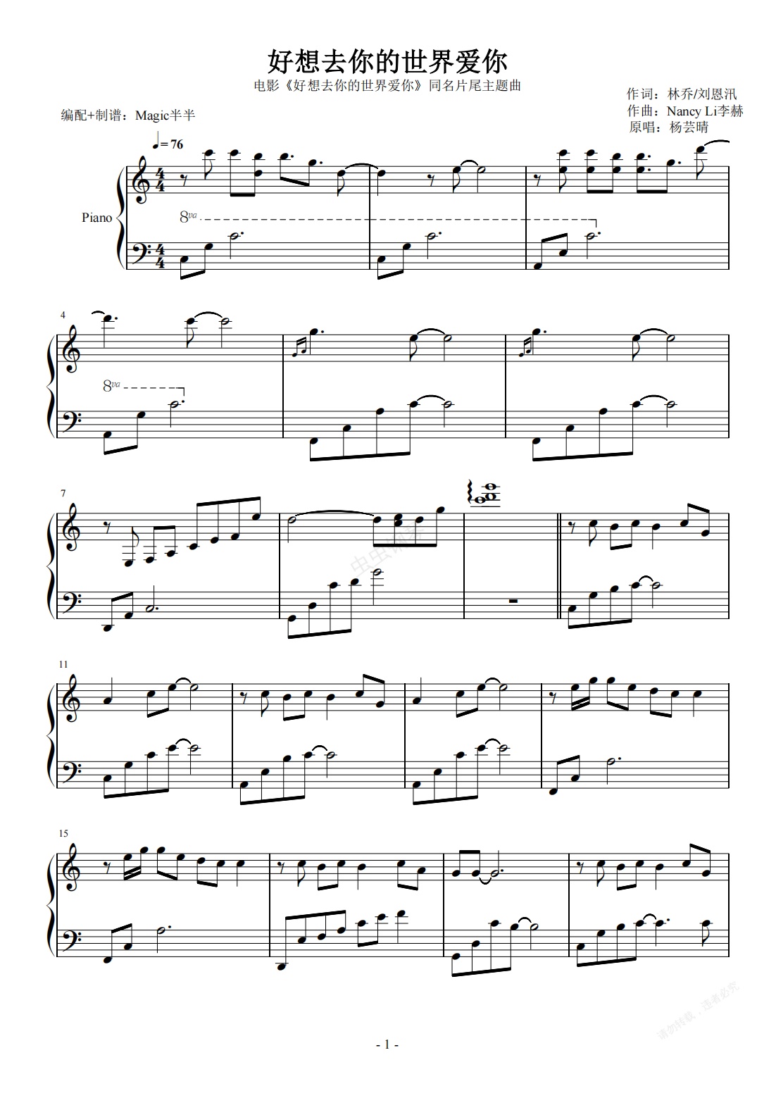 钢琴谱:好想去你的世界爱你(C调简易) 同名电影片尾主题曲