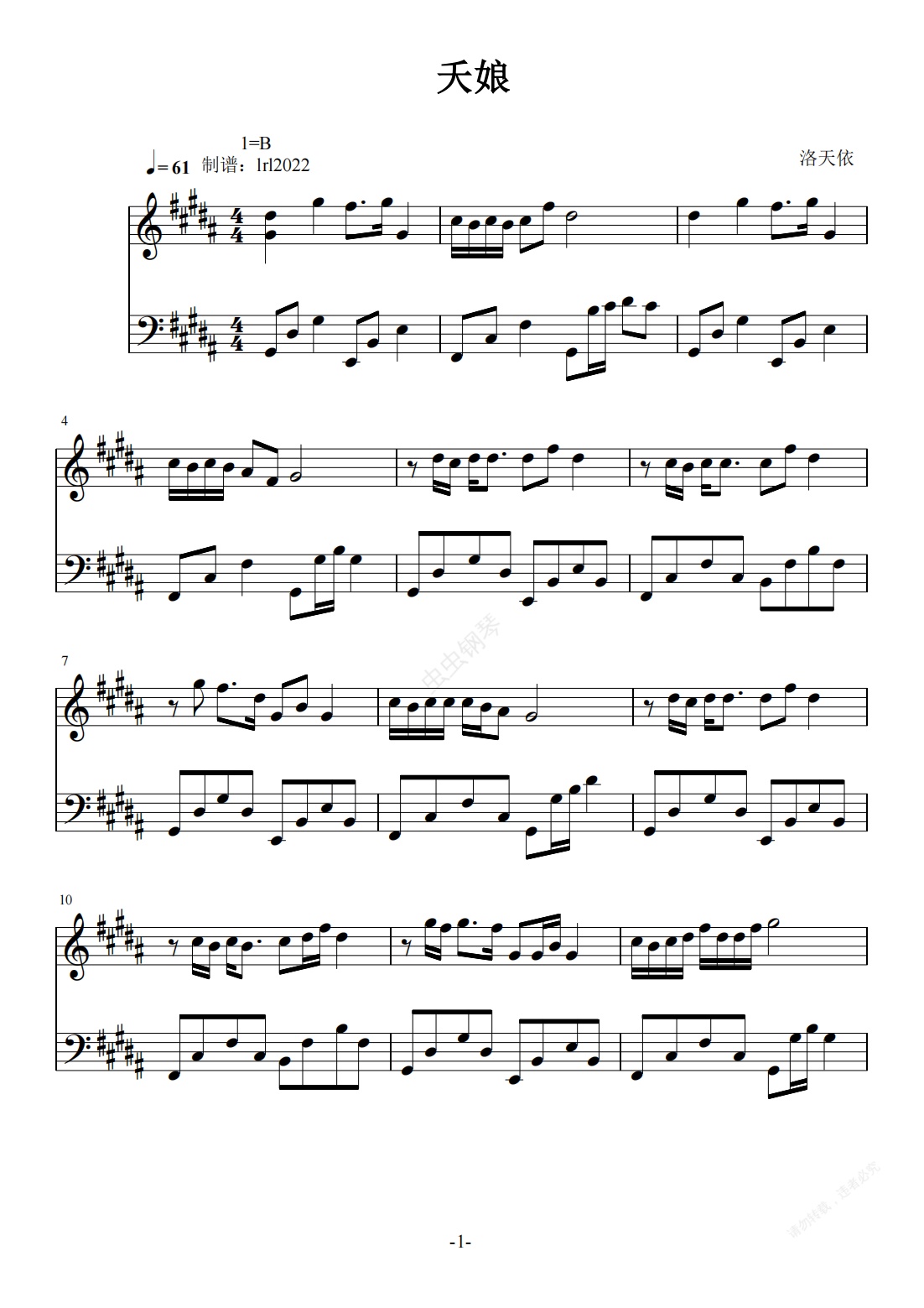 钢琴谱:夭娘洛天依B大调乐谱