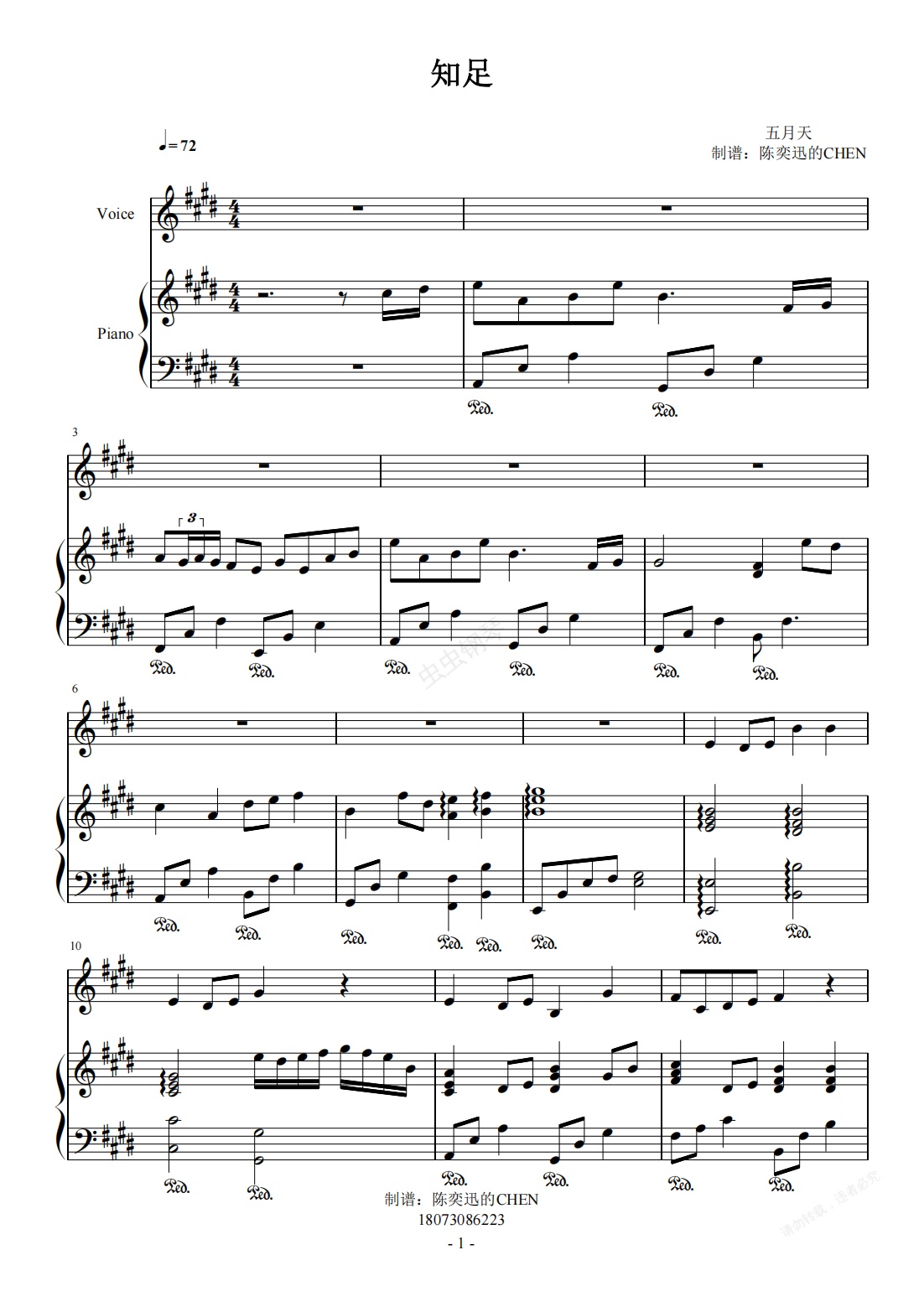 钢琴谱:知足 五月天 完美弹唱谱
