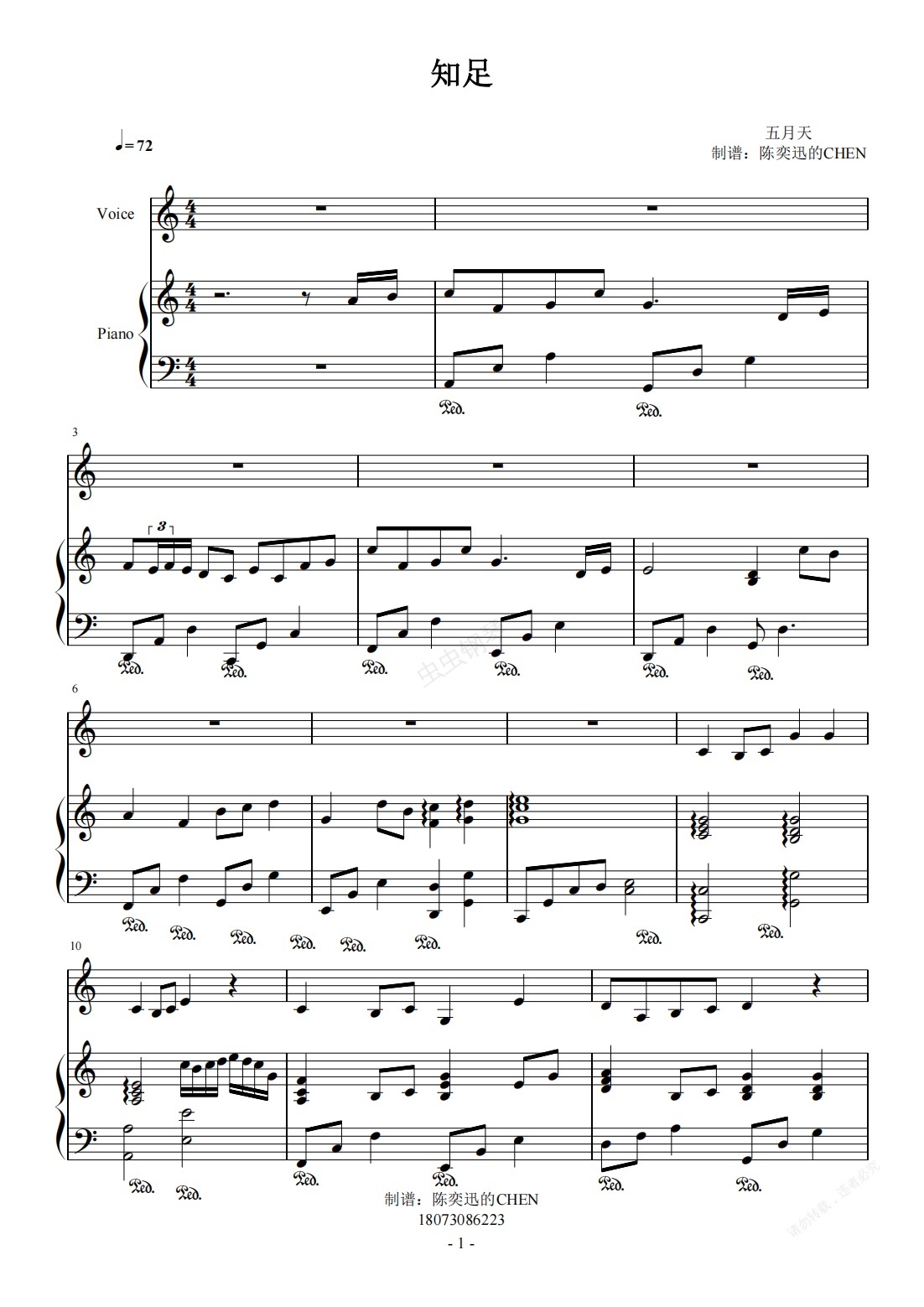 钢琴谱:知足 C调弹唱谱【简单好听】