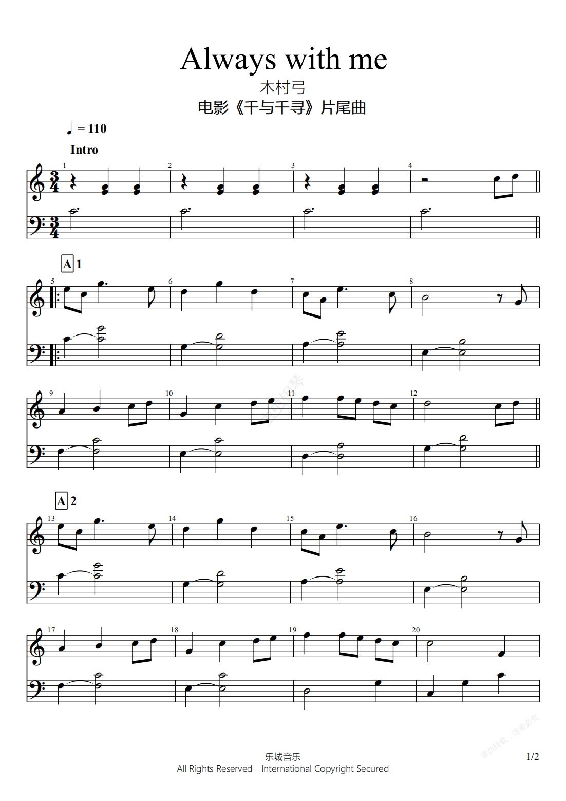 钢琴谱:Always With Me 木村弓 C调完美版