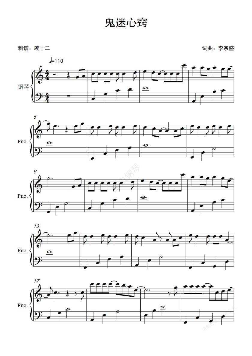 钢琴谱:鬼迷心窍-C调简单版-末代皇孙主题曲