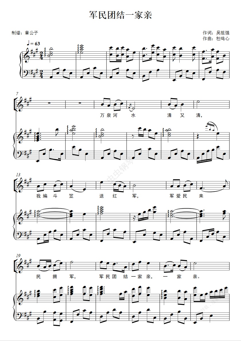 钢琴谱:《军民团结一家亲》(万泉河水清又清) 混声合唱伴奏谱