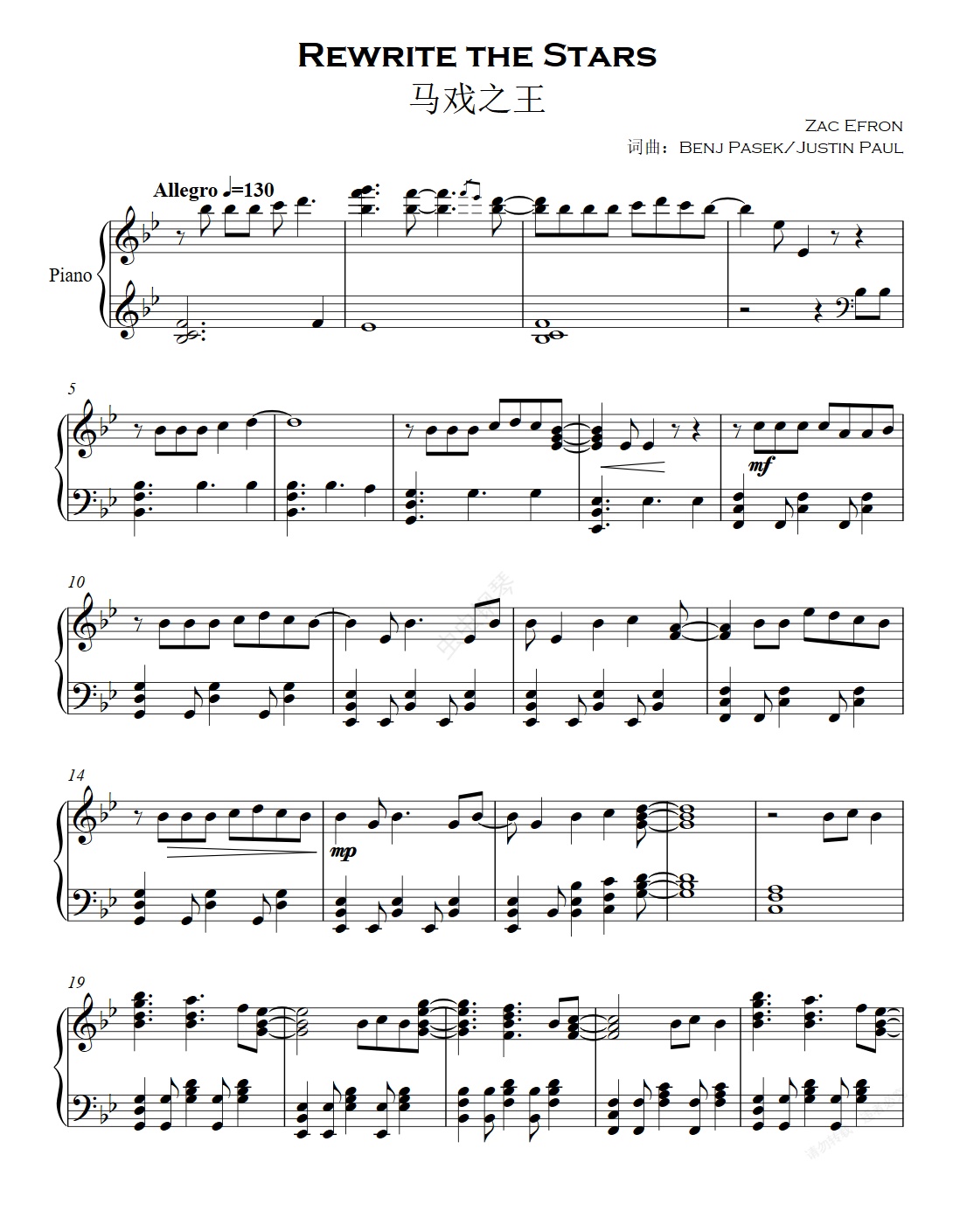 钢琴谱:Rewrite the Stars 马戏之王
