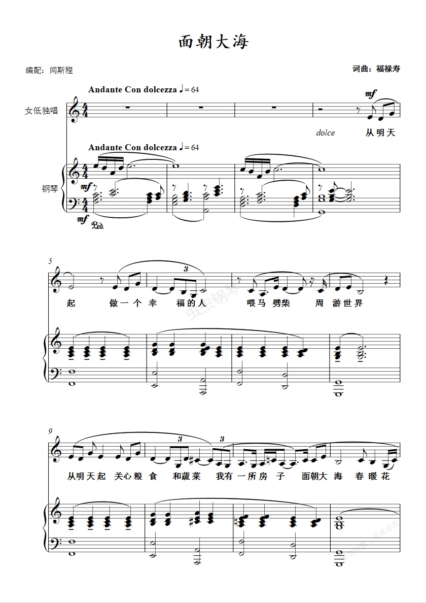 钢琴谱:面朝大海-福禄寿-原版C调弹唱