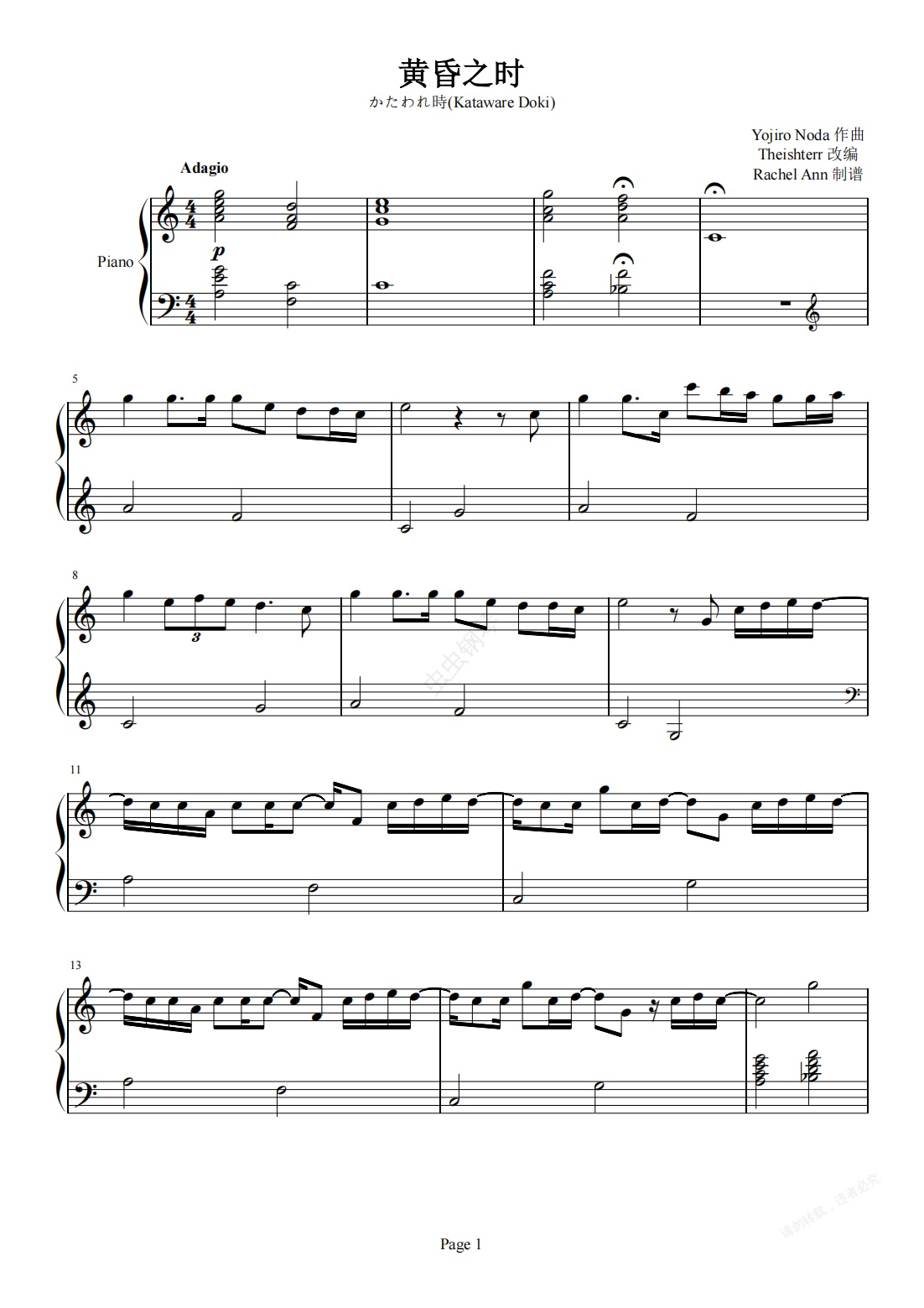 • 黄昏之时Kataware Doki(你的名字)Theishter钢琴版C大调