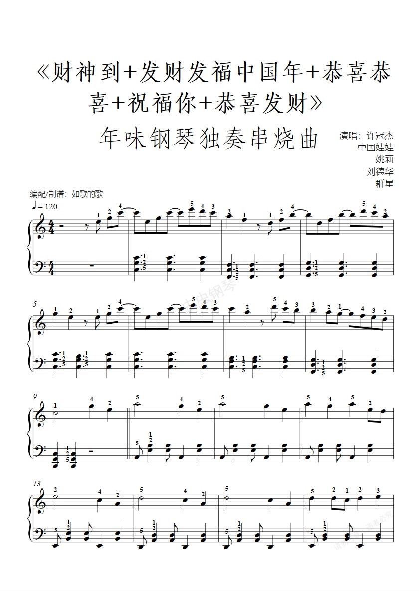 钢琴谱:春节贺岁神曲串烧卤煮599程度带指法