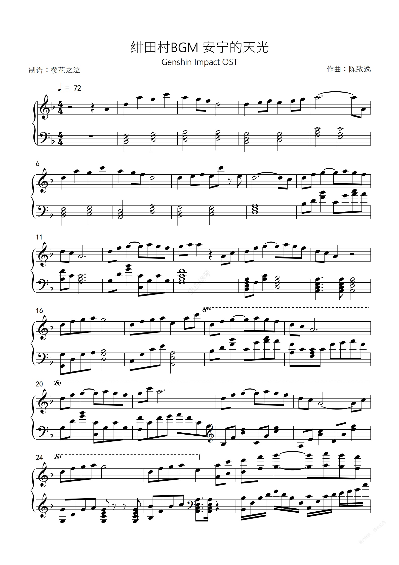 钢琴谱:原神 绀田村BGM 安宁的天光