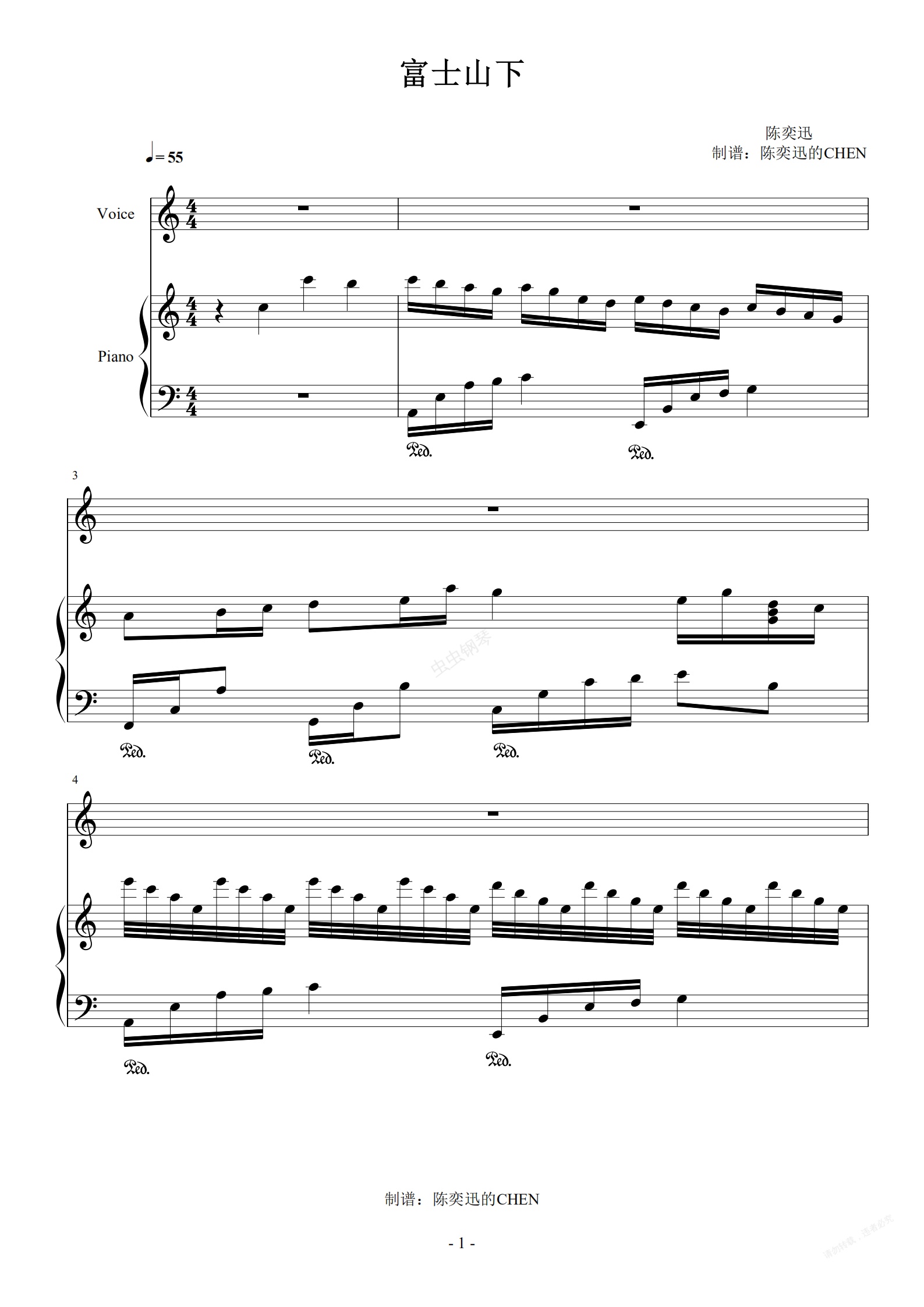 钢琴谱:富士山下 C调完美弹唱谱【附歌词】