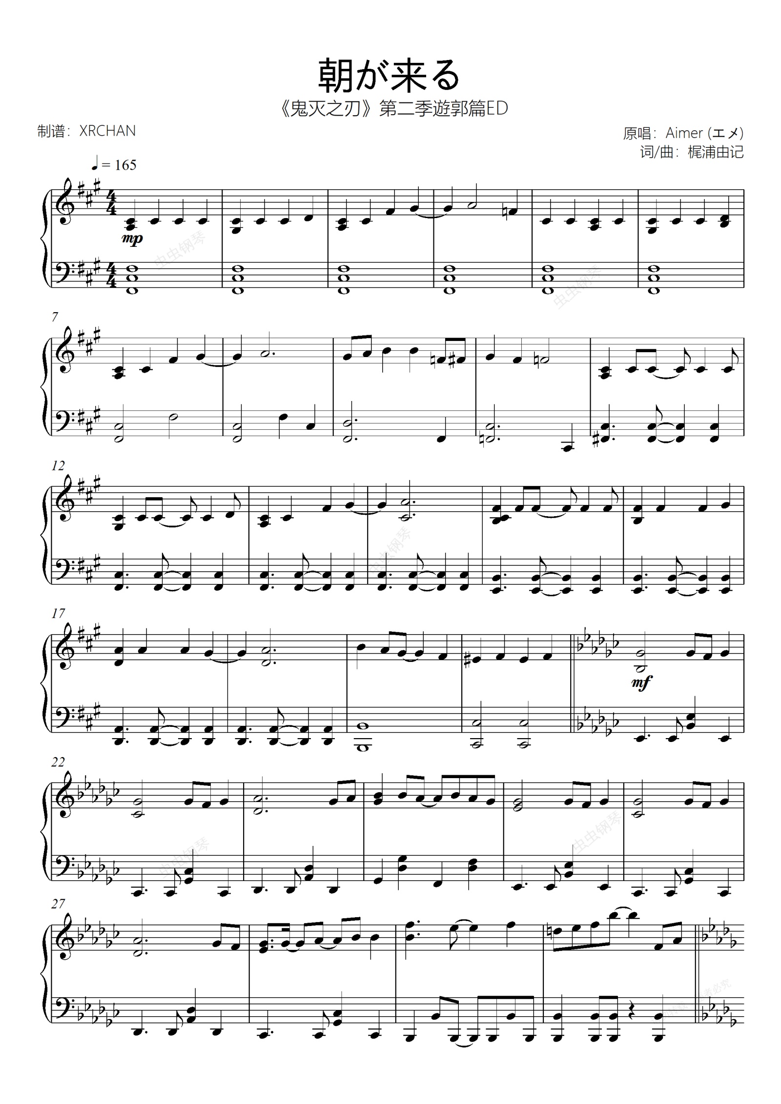 钢琴谱:《鬼灭之刃》第二季遊郭篇ED 朝が来る