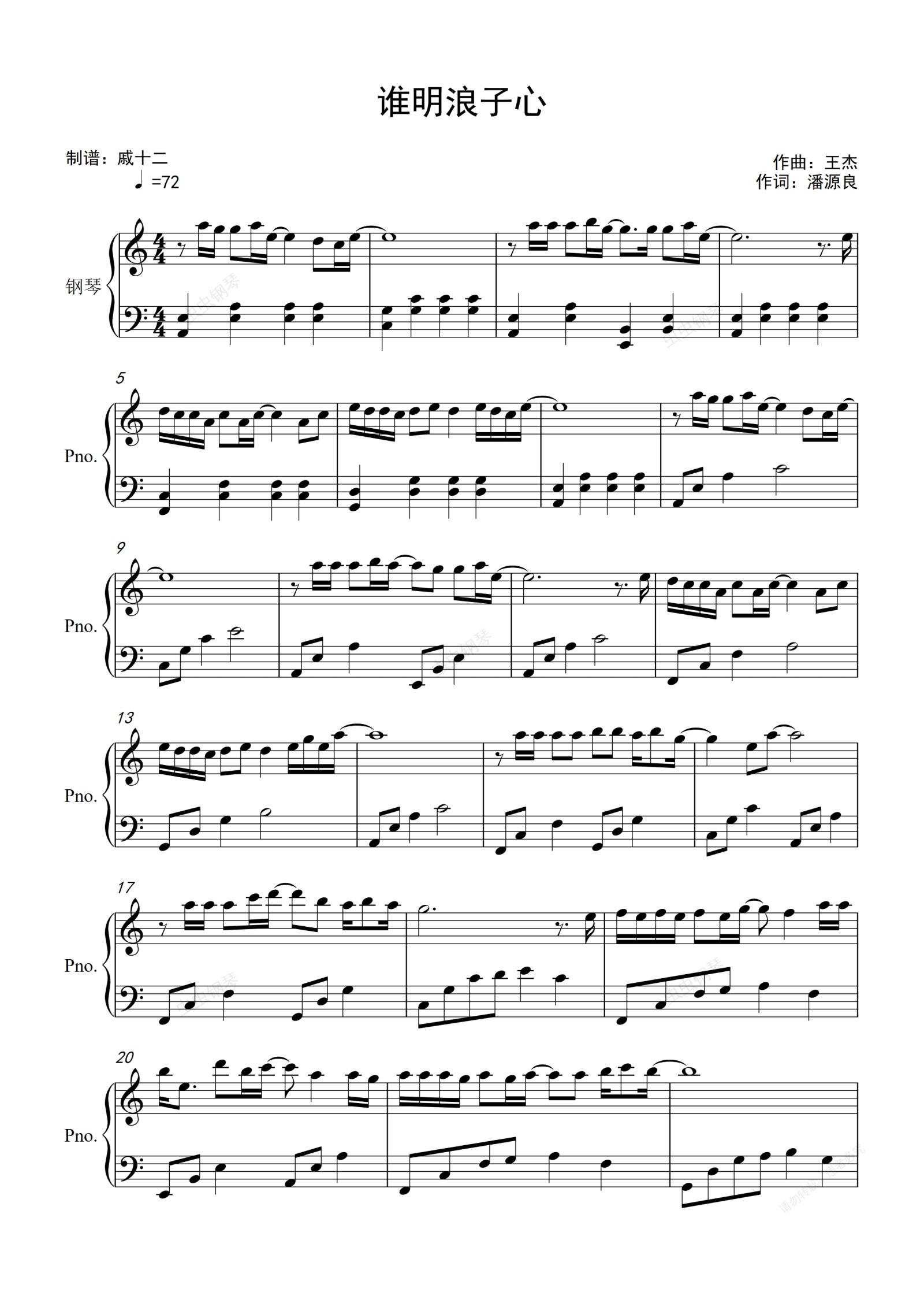 钢琴谱:谁明浪子心-C调简单版-还我本色主题曲