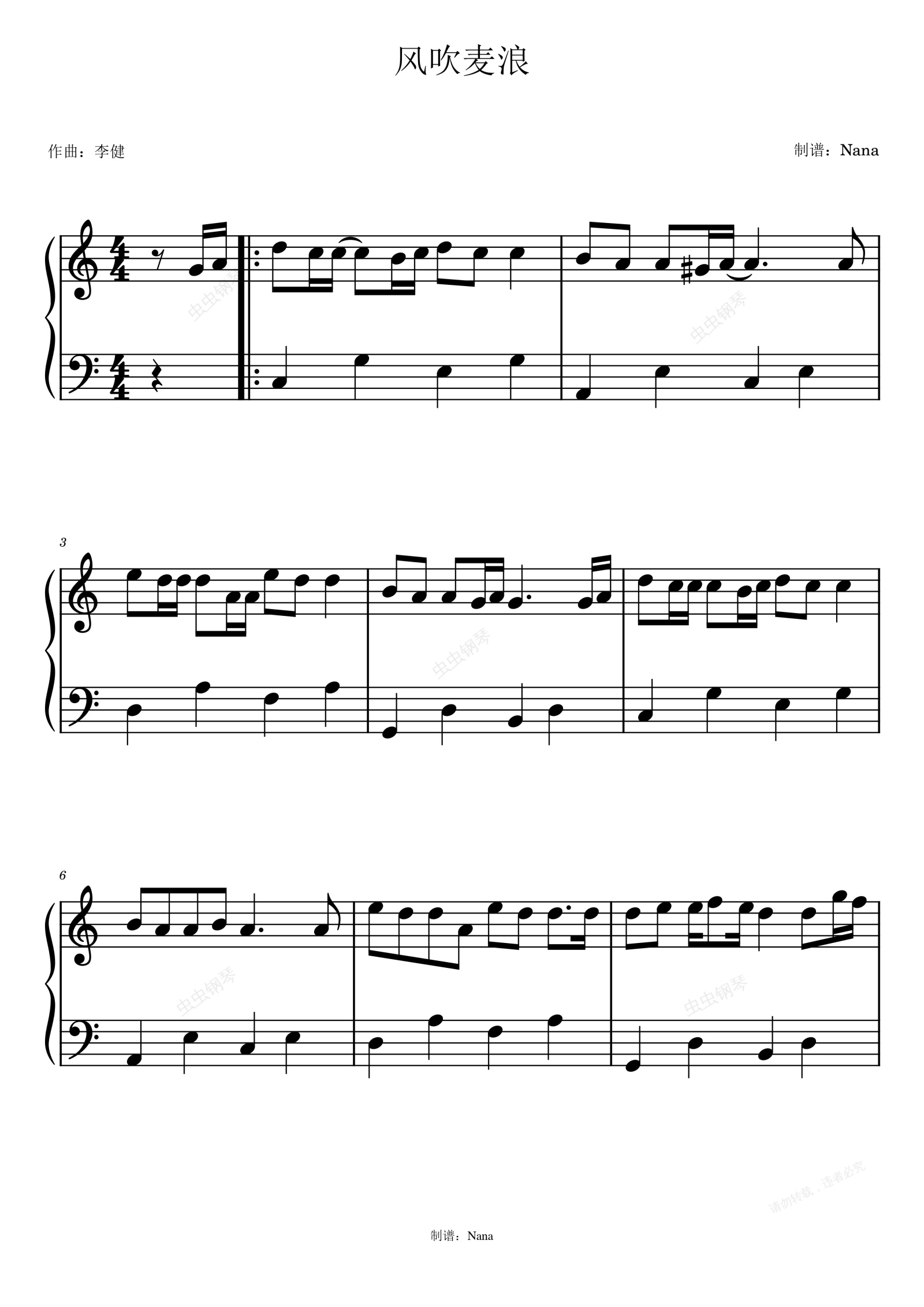 钢琴谱:风吹麦浪C调简易版