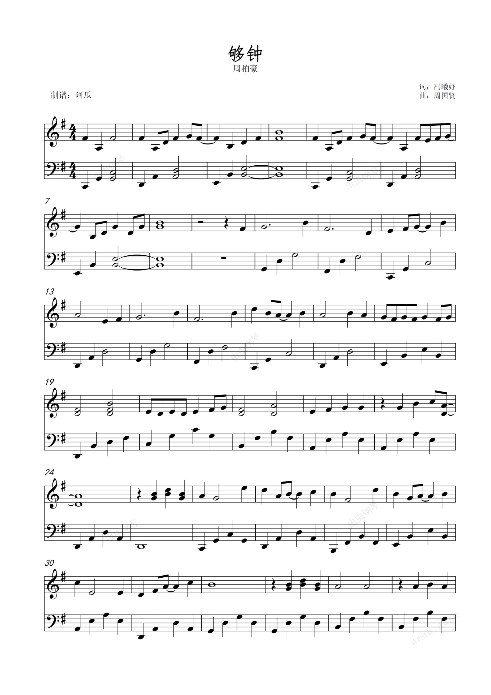 钢琴谱:够钟-周柏豪-原调简单易上手