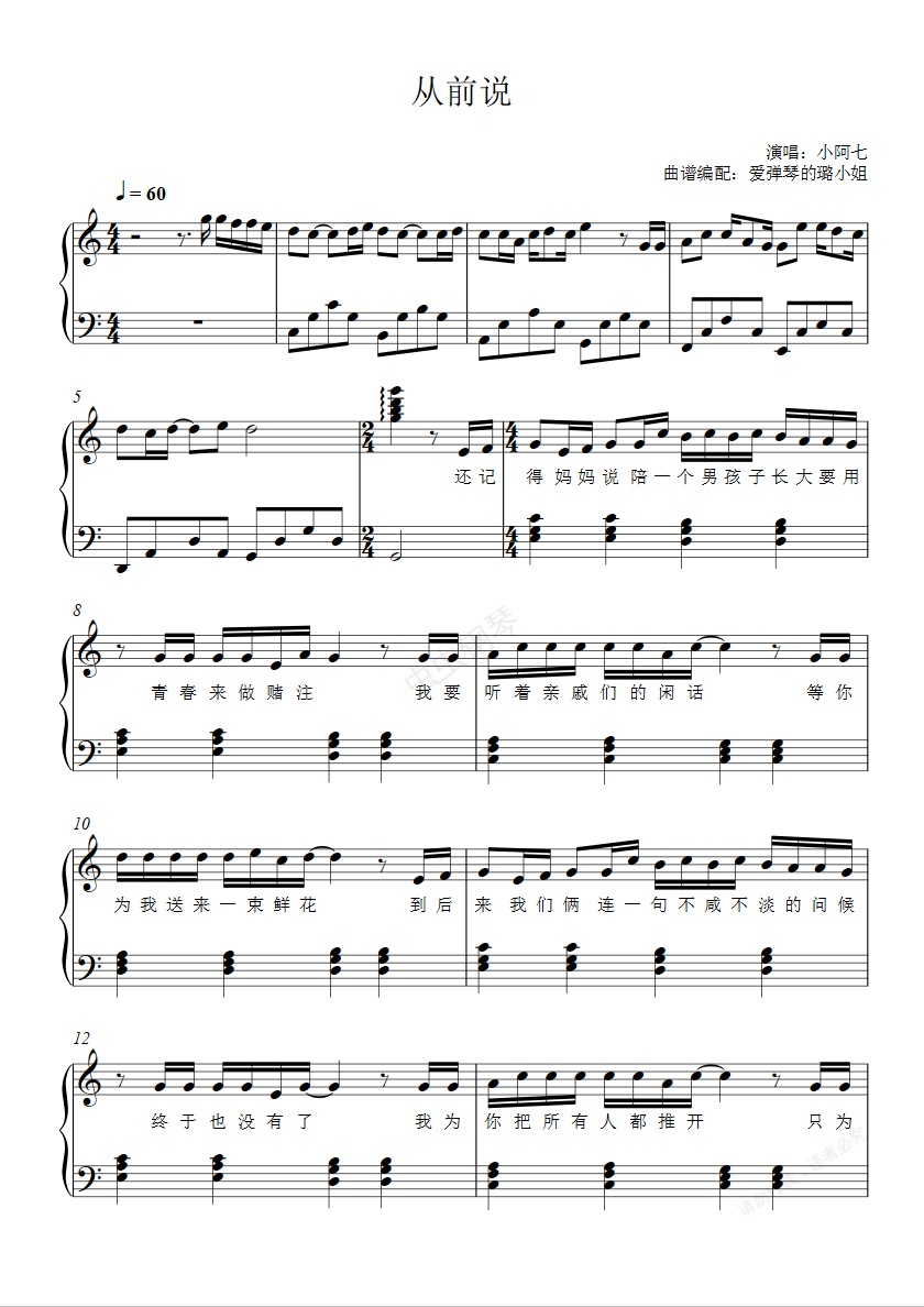 钢琴谱:从前说 - 抖音热歌 - C调简单版(附歌词)