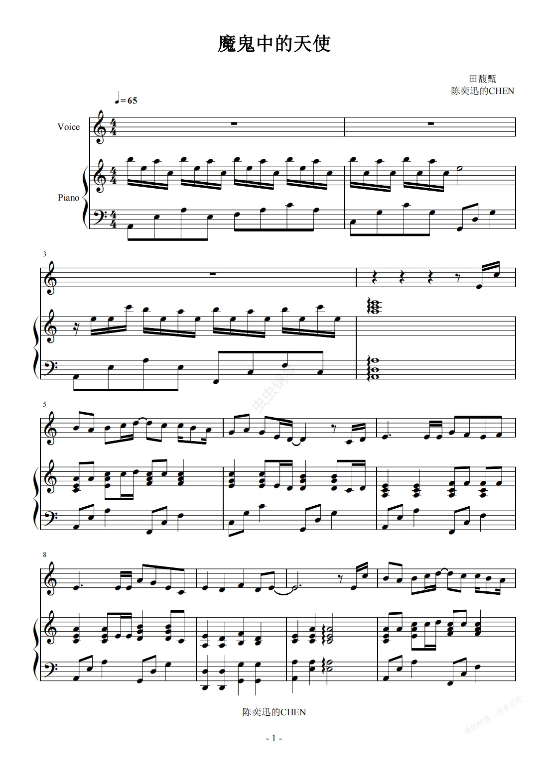 钢琴谱:魔鬼中的天使C调完美弹唱谱