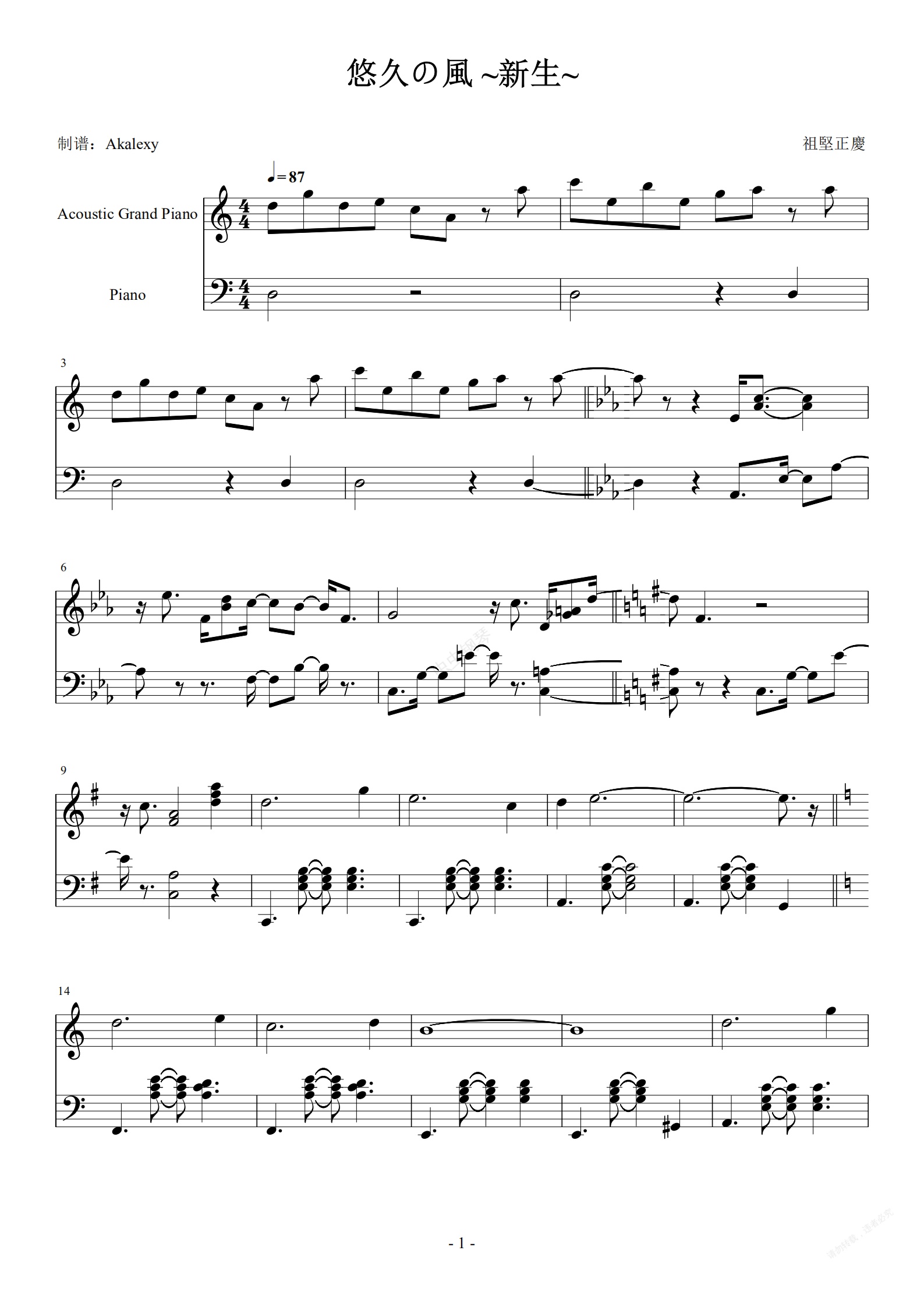 钢琴谱:最终幻想14【悠久の風 ~新生~】