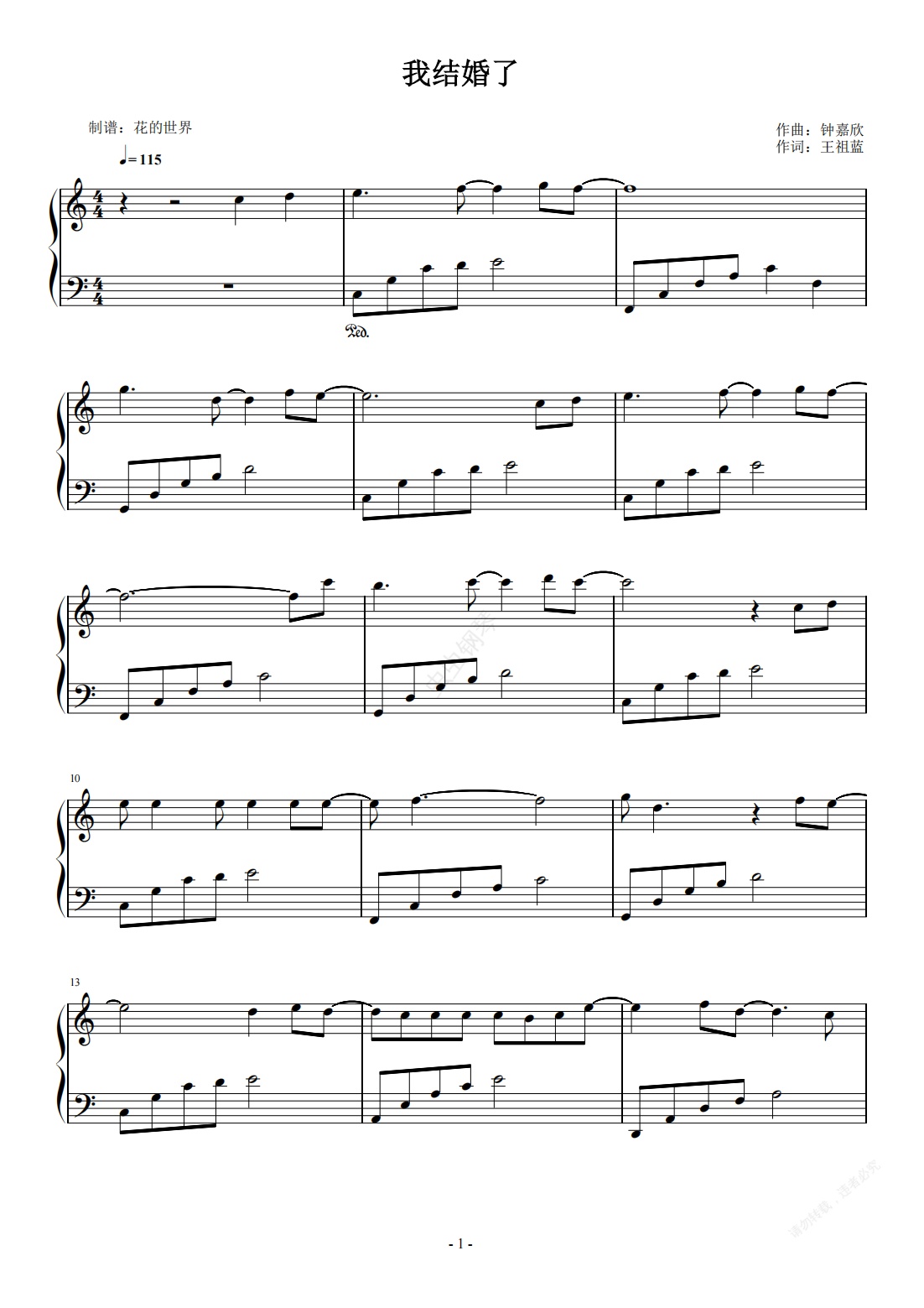 钢琴谱:我结婚了 C调简易版 钟嘉欣