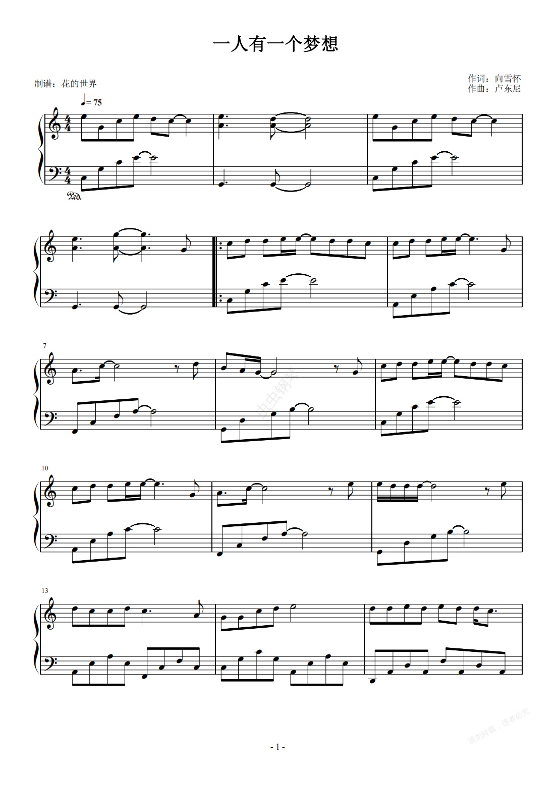 钢琴谱:一人有一个梦想 C调简易版 黎瑞恩