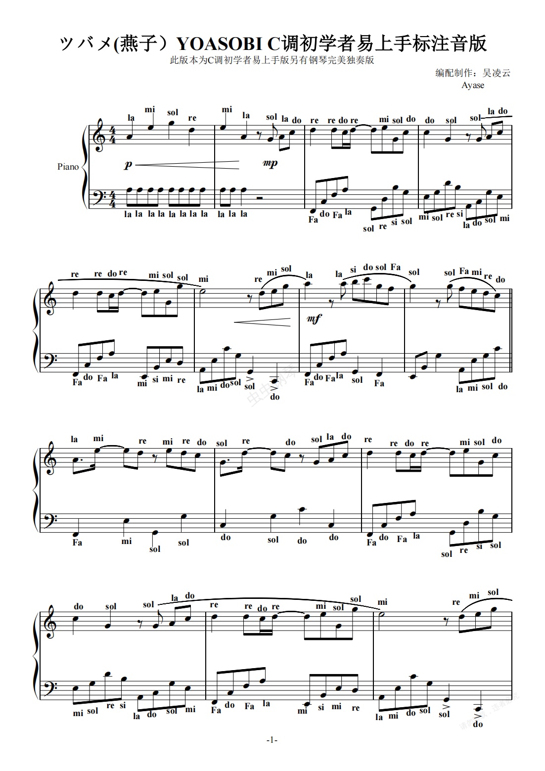 钢琴谱:ツバメ(燕子)YOASOBI C调初学者易上手标注音版 吴凌云编配简单版