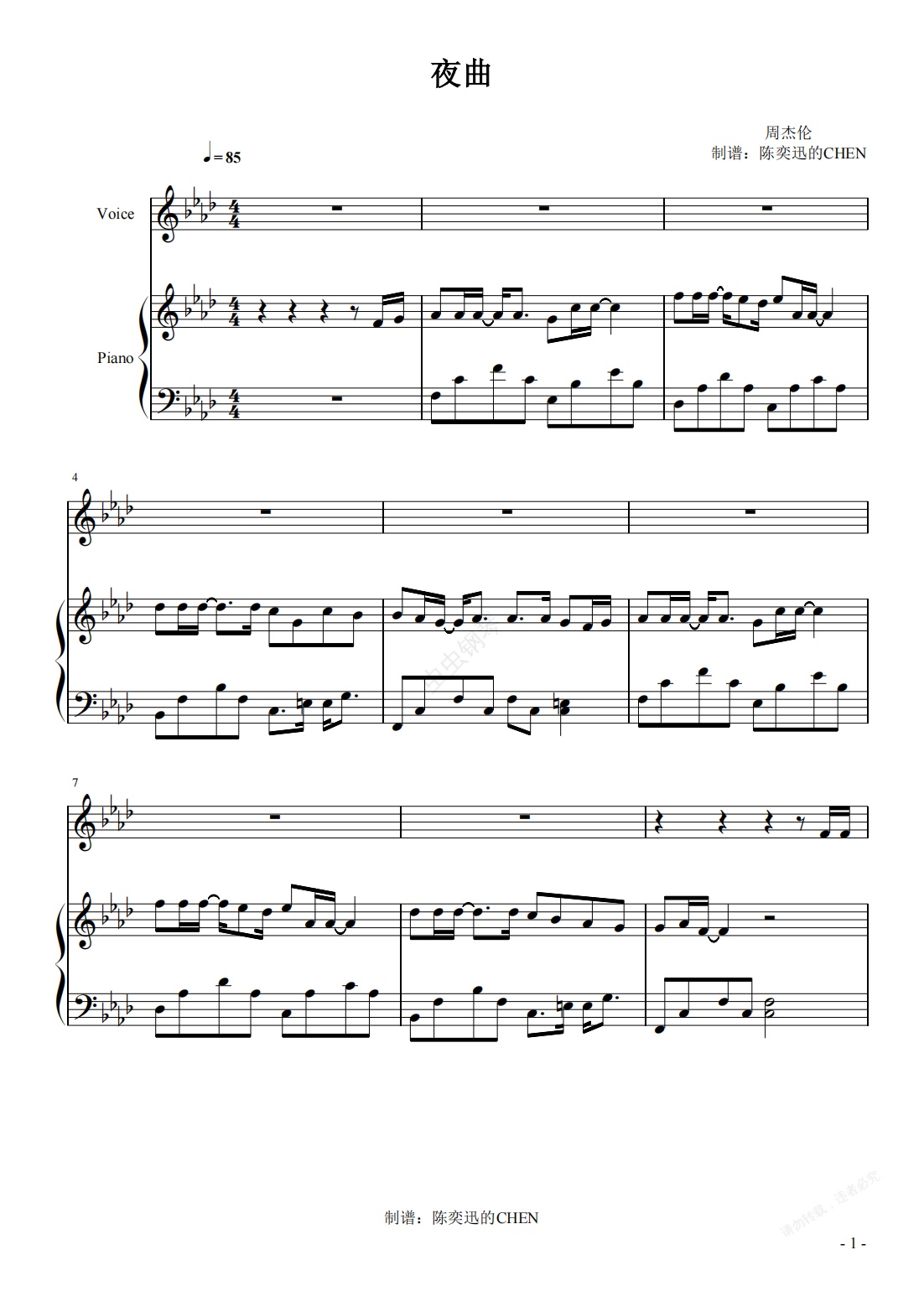 钢琴谱:夜曲 完美弹唱谱