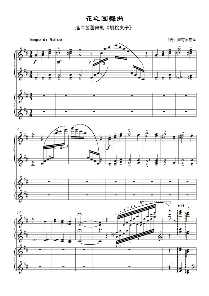 胡桃夹子》是由列夫•伊凡诺夫编导,柴可夫斯基作曲的俄罗斯古典芭蕾舞剧。1892年首演于圣彼得堡玛丽亚剧院。根据霍夫曼的《胡桃夹子与老鼠王》的童话故事改编。舞剧的音乐充满了单纯而神秘的神话色彩,具有强烈的儿童音乐特色。被西方称为“圣诞芭蕾”。讲述了圣诞节,女孩玛丽得到一只胡桃夹子。夜晚,她梦见这胡桃夹子变成了一位王子,领着她的一群玩具同老鼠兵作战。后来又把她带到果酱山,受到梅糖仙子的欢迎,享受了一次玩具、舞蹈和盛宴的快乐的故事。