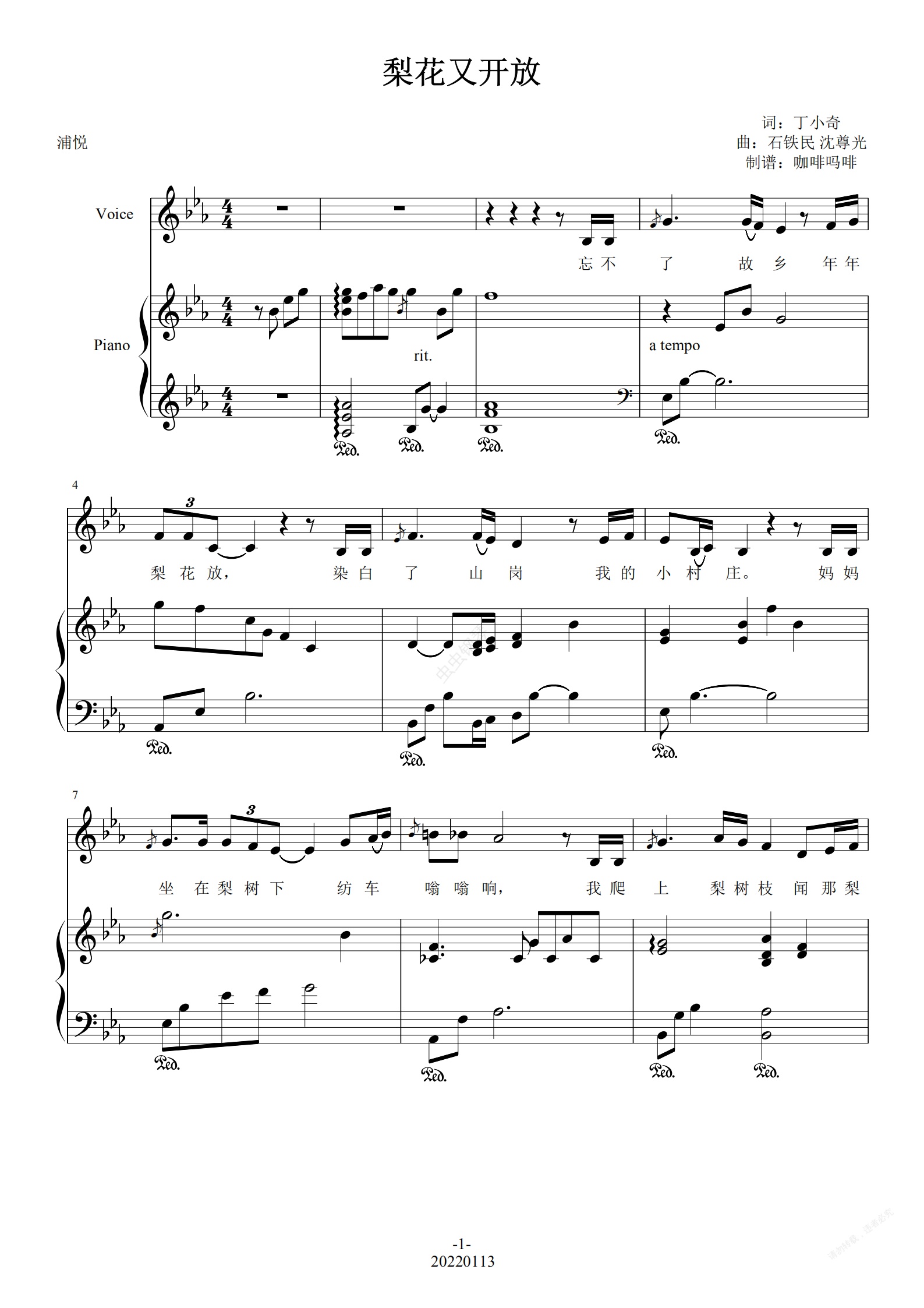 钢琴谱:梨花又开放-浦悦 bE调完美伴奏浦