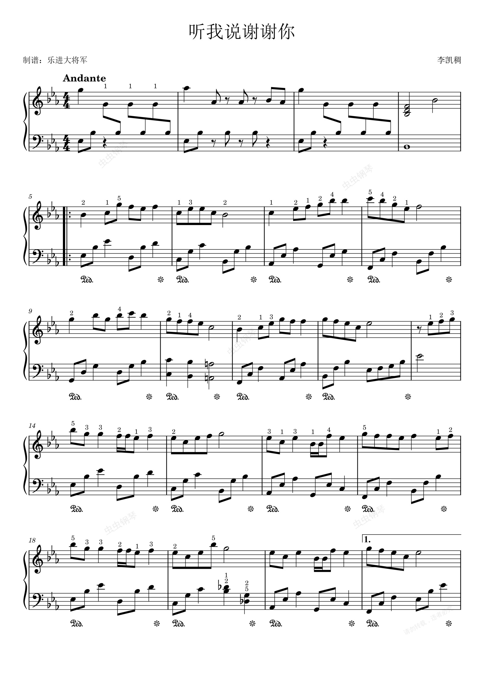 钢琴谱:声乐歌曲《听我说谢谢你》 原调精简版
