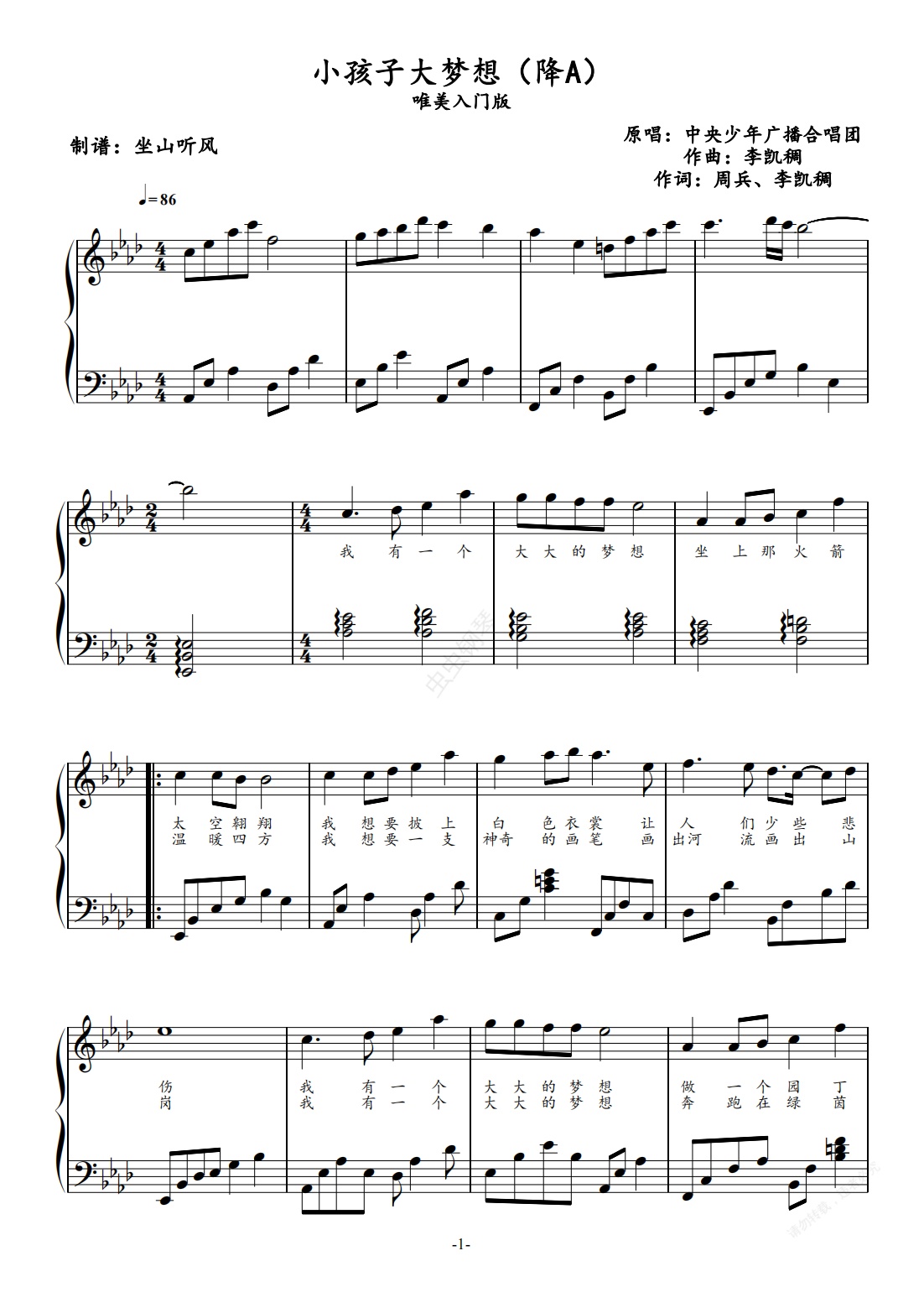 钢琴谱:【降A】小孩子大梦想——唯美入门版