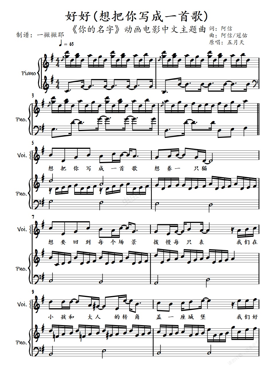 钢琴谱:【女版弹唱】好好-五月天「一撇撇耶」