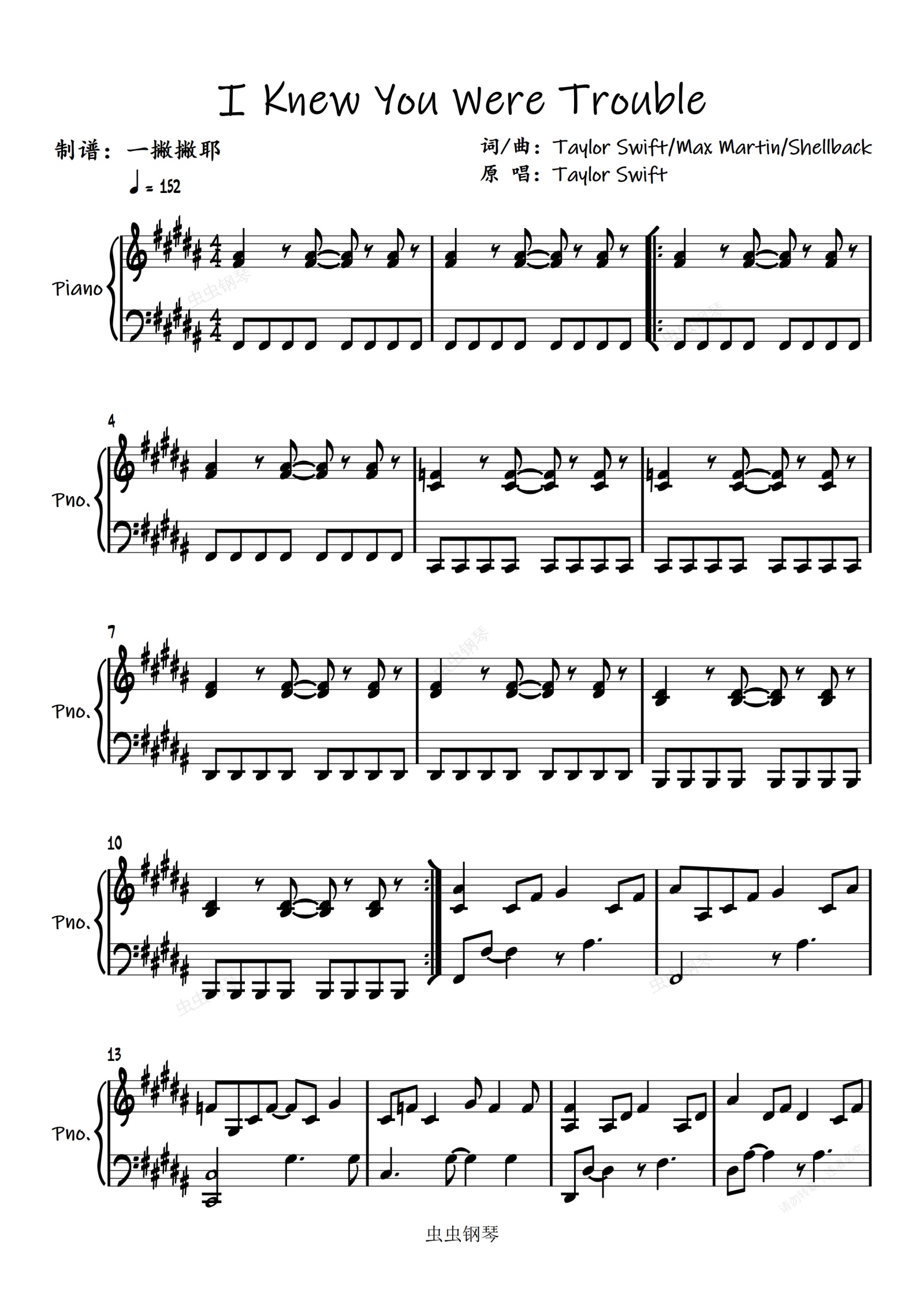 钢琴谱:【完美伴奏】I Knew You Were Trouble-Taylor Swift「一撇撇耶」