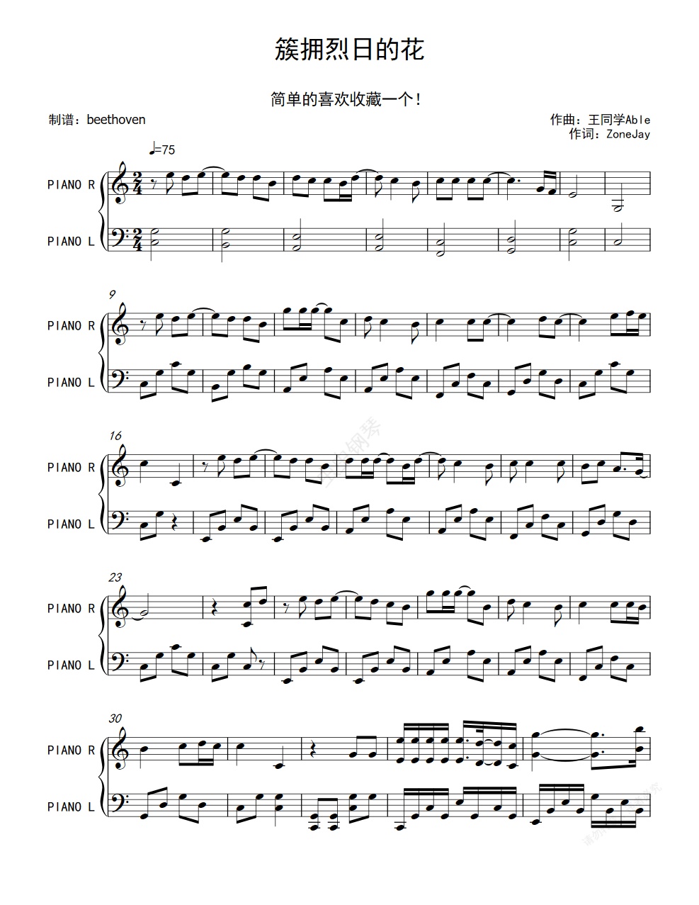 钢琴谱:簇拥烈日的花-迟里乌布-简单