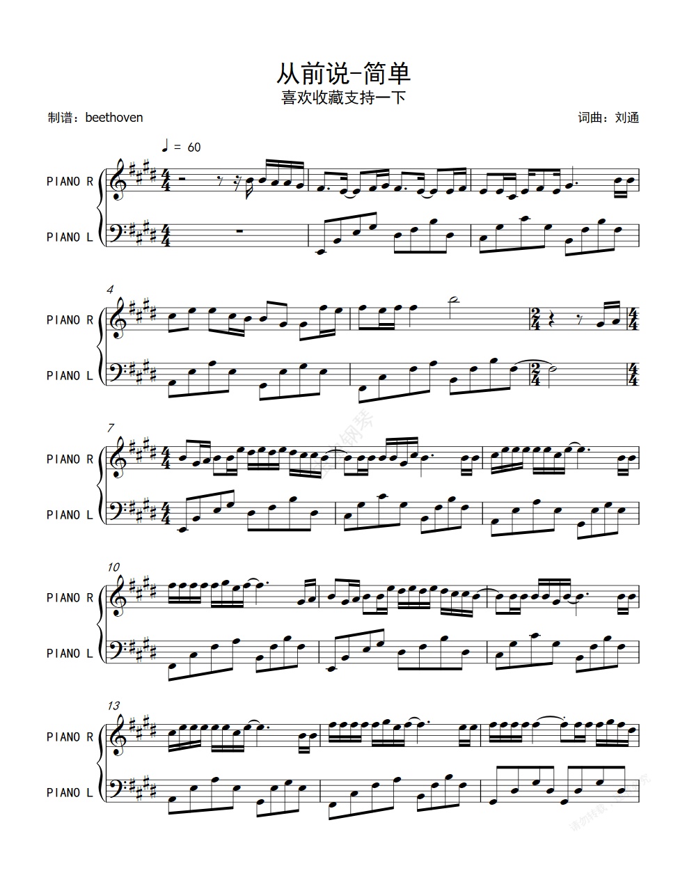 钢琴谱:从前说-小阿七-抖音热歌简单