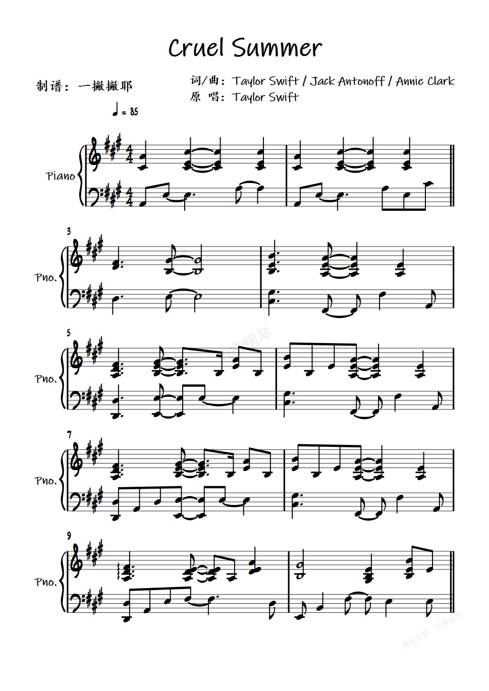 钢琴谱:【唯美弹唱】Cruel Summer-Taylor Swift 泰勒·斯威夫特「一撇撇耶」