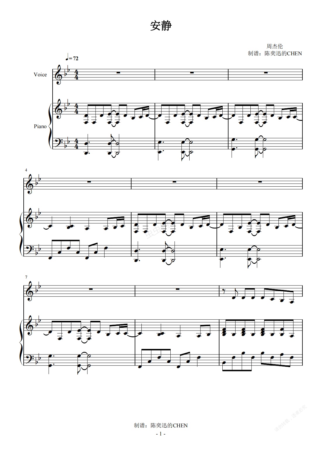 钢琴谱:安静原调弹唱谱