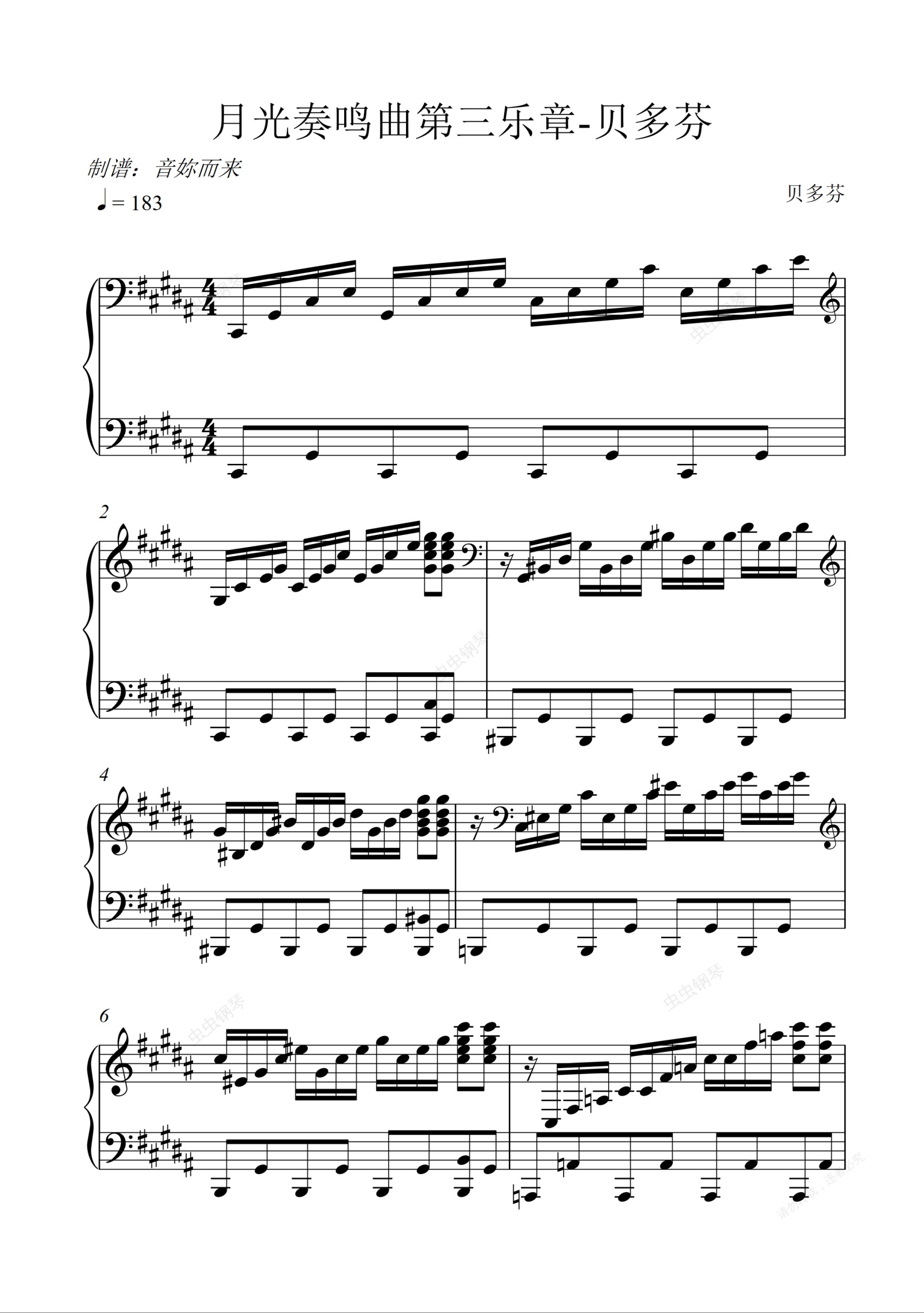 著名的#c小调贝多芬钢琴奏鸣曲创作于1801年,往往被称做“月光奏鸣曲”。实际上,这一称号由来是诗人路德维希•莱尔斯塔勃把该奏鸣曲第一乐章比做费尔伐里斯吉特湖上月色的夜景。该曲谱是月光奏鸣曲第三乐章。