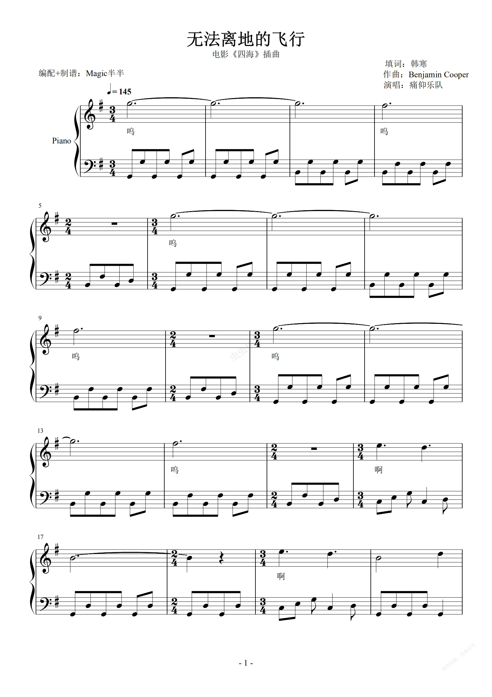钢琴谱:无法离地的飞行(原调简版) 电影<四海>插曲