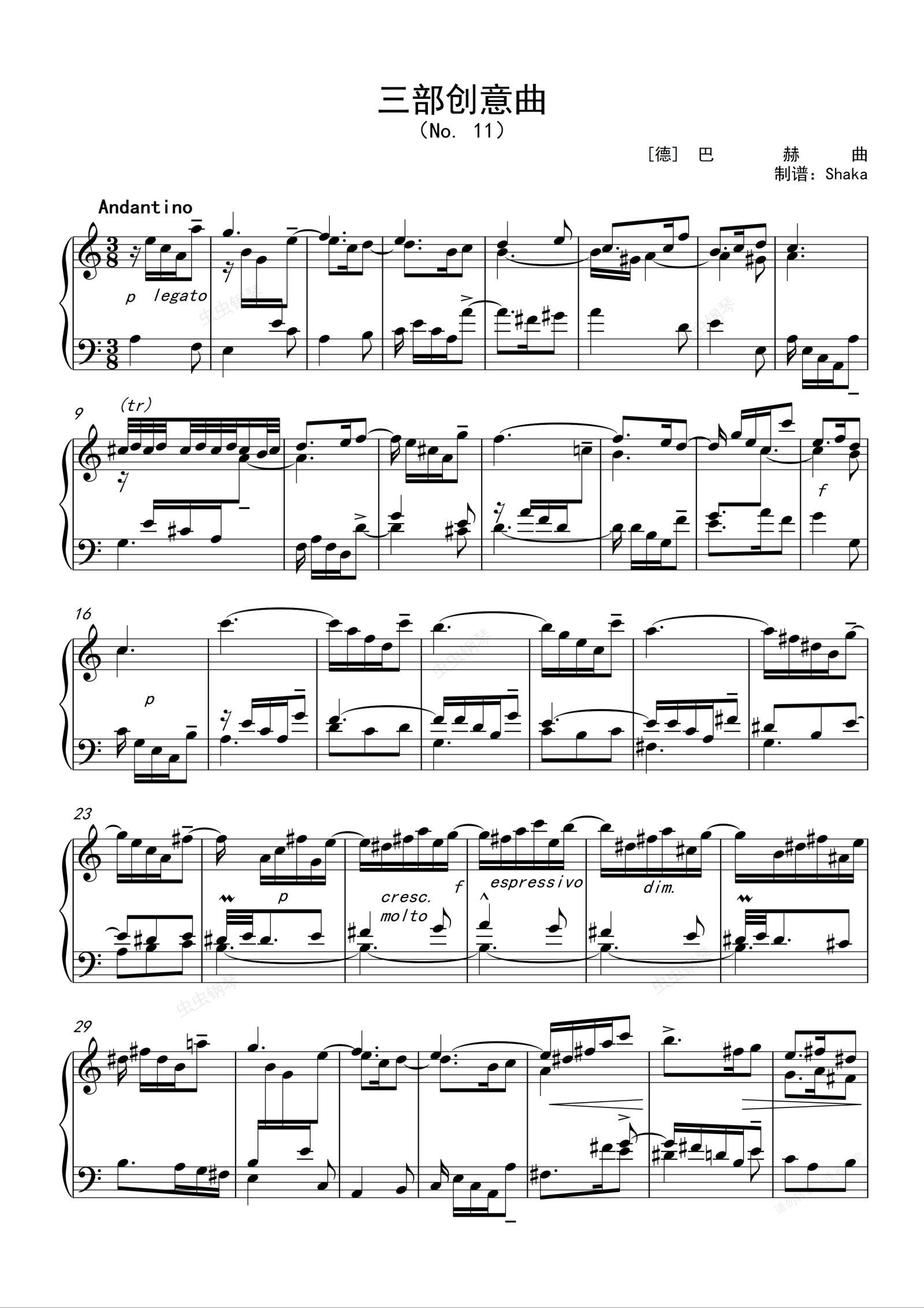 钢琴谱:巴赫 三部创意曲No.11(a小调版)