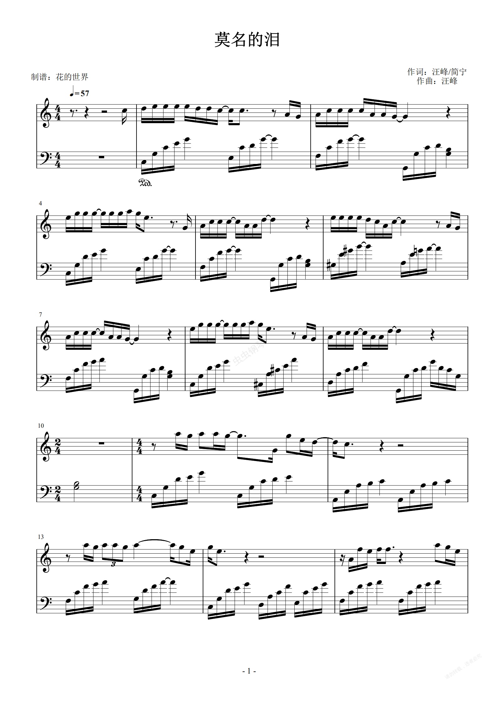 钢琴谱:莫名的泪 C调简易版 谭咏麟(当我想你的时候)